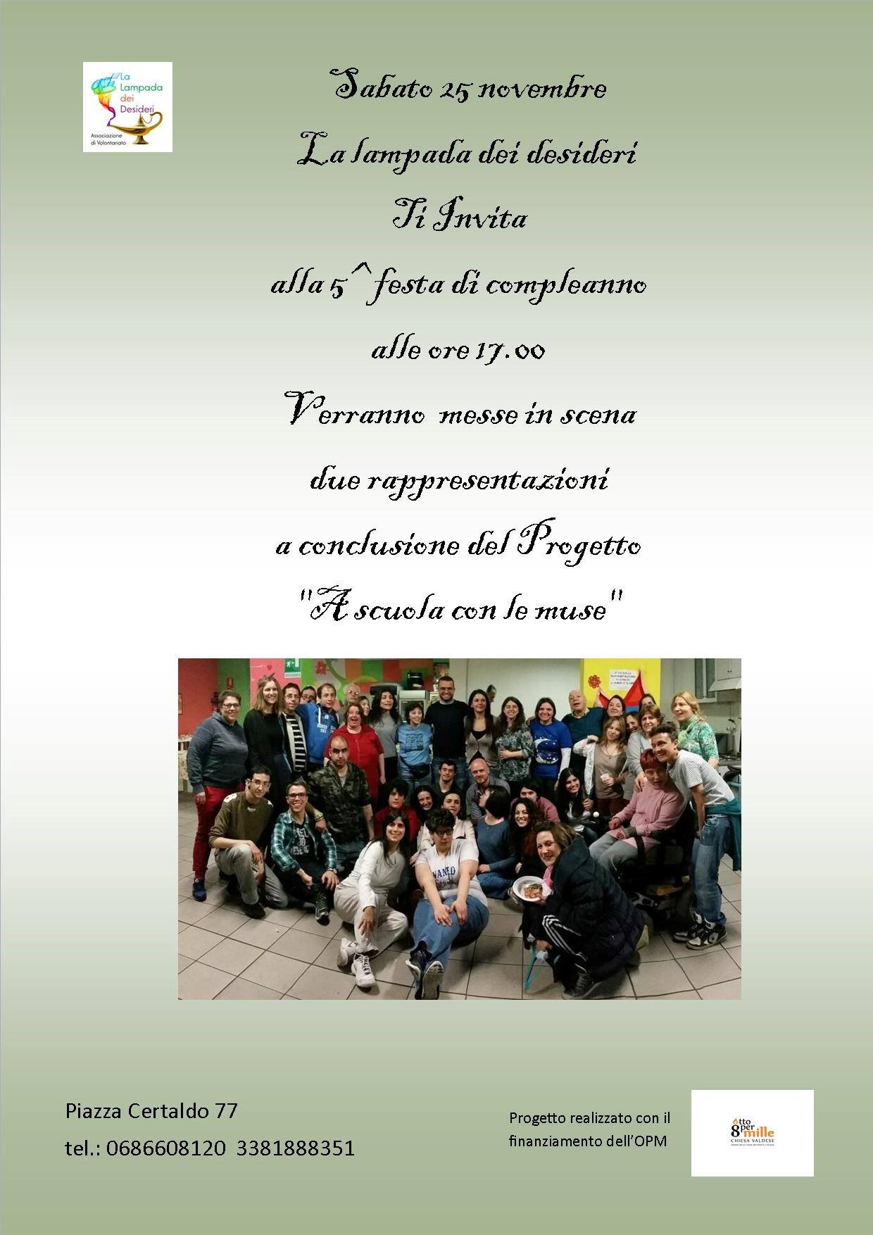 La lampada desideri organizza per sabato 25 novembre 2017 dalle ore 16.30 la 5a Festa di Compleanno dell'associazione che avrà luogo a Roma‚ in Piazza Certaldo 77. Quest'anno ci saranno due rappresentazioni sul tema di “NO AL BULLISMO” in conclusione a laboratori multi-disciplinari‚ che hanno avuto la durata di circa dieci mesi intitolati “A scuola con le muse”: musica‚ danza‚ banda‚ teatro‚ corto cinematografico‚ scenografia‚ tutte queste arti sviluppate per questo obiettivo.