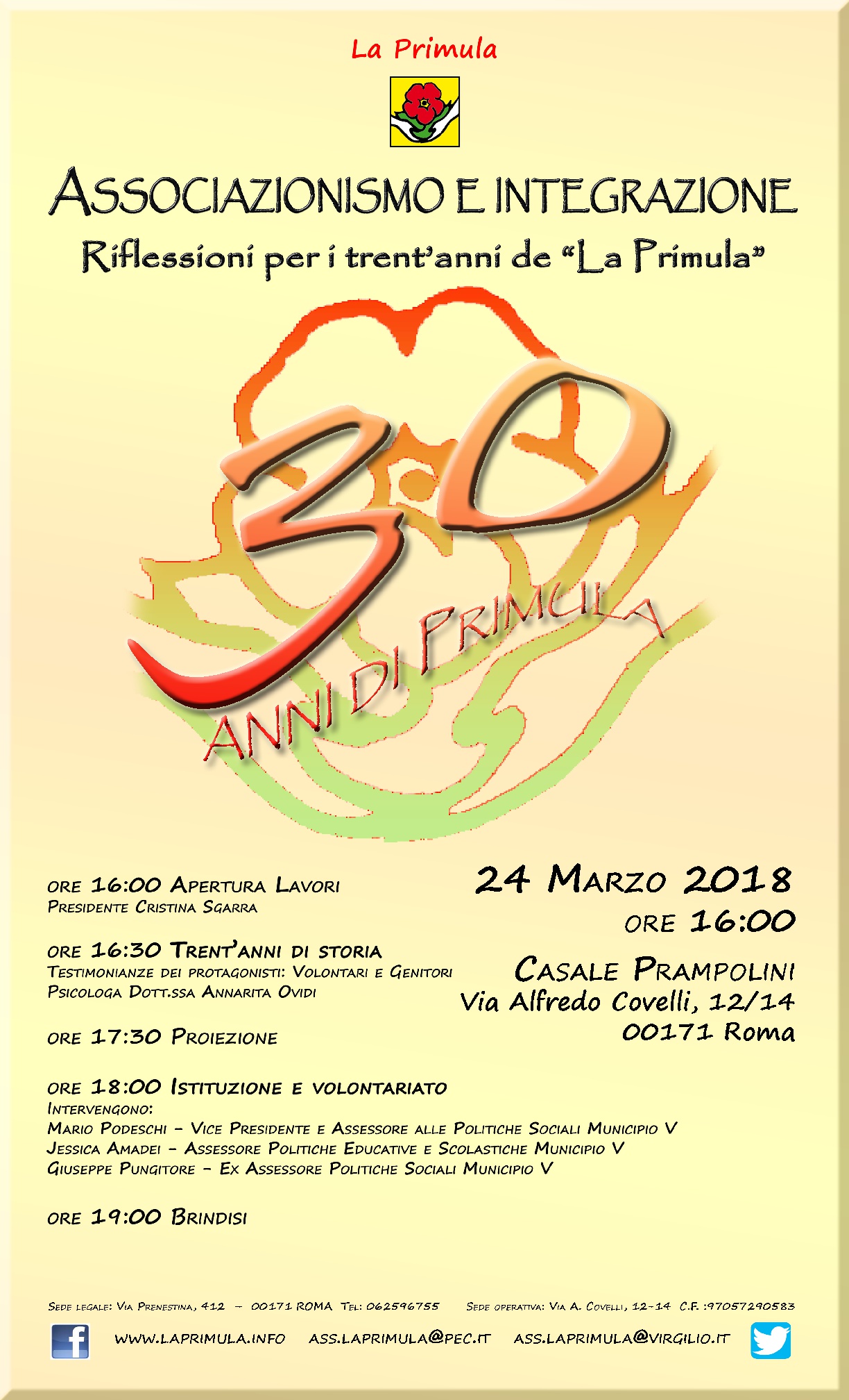 Il 24 Marzo 2018 alle ore 16.00‚ presso Casale Prampolini‚ in Via Alfredo Covelli‚ 12/14 Roma‚ nel convegno Associazionismo e integrazione si racconteranno i trenta anni dell’associazione La Primula attraverso le parole di volontari e genitori ed in uno spazio di confronto tra volontariato e istituzioni. L’associazione La Primula promuove e valorizza l'inclusione delle persone con disabilità attraverso laboratori artistici e artigianali e con attività di sensibilizzazione sul territorio del V municipio di Roma Capitale. Per informazioni scrivi a: ass.laprimula@virgilio.it chiama il tel. 06.2596755 oppure visita il sito: www.laprimula.info