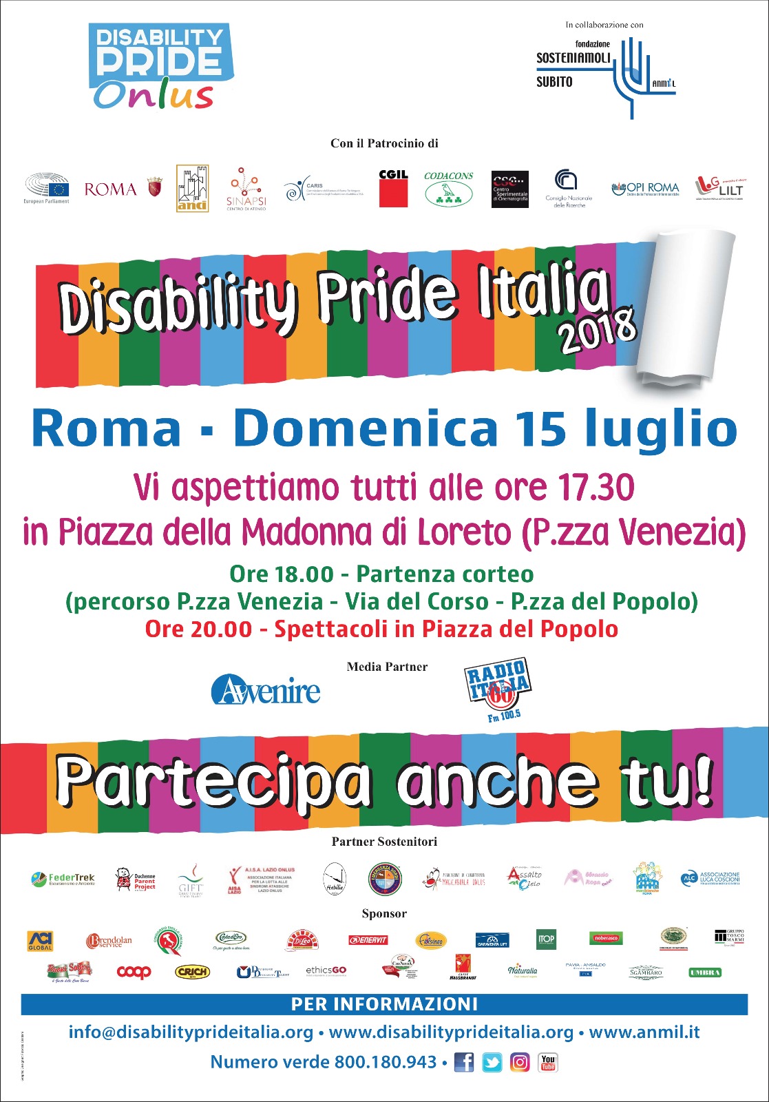 Domenica 15 luglio 2018 alle ore 17.30‚ in piazza Madonna di Loreto (Piazza Venezia) si svolge il Disability Pride‚ che nasce con l’obiettivo di portare la disabilità nella sua interezza e complessità‚ tra la gente comune. Persone che chiedono di avere le stesse “opportunità” degli altri‚ rivendicando il loro essere cittadini come tutti. L'evento‚ promosso dall’Associazione Disability Pride Onlus‚ in collaborazione con la fondazione Sosteniamoli Subito e il patrocinio del Parlamento Europeo‚ Roma Capitale‚ CGIL‚ Anci‚ Sinapsi‚ Opi Roma; Lilt; Codacons e molti altri‚ sarà presentato con una conferenza stampa prevista per lunedì 9 luglio 2018 alle are 11.00 in Campidoglio presso la Sala della Piccola Protomoteca. Alle ore 18.00 ci sarà la partenza del corteo da Piazza Venezia che proseguirà per Via del Corso fino ad arrivare a Piazza del Popolo. Alle ore 20.00 infine‚ ci saranno gli spettacoli proprio a Piazza del Popolo. Per partecipare: http://disabilityprideitalia.org/contact/ Mail: info@disabilityprideitalia.org – Numero Verde 800 180 943 Sito web: www.disabilitypride.org – www.anmil.it
