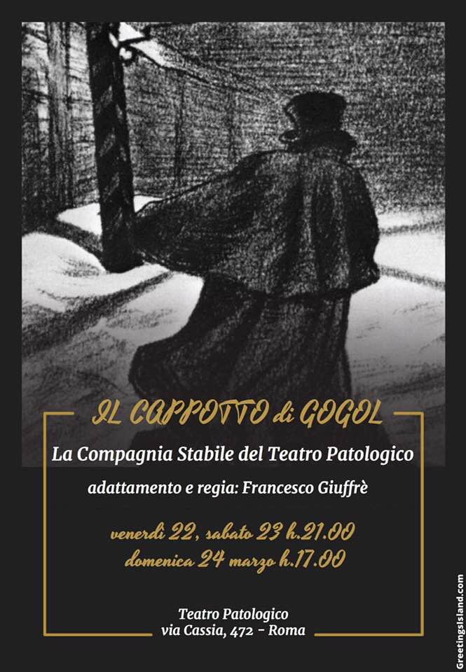 La Compagnia Stabile del Teatro Patologico mette in scena lo spettacolo il Cappotto di Gogol dal venerdì 22 a domenica 24 marzo presso l'Associazione Teatro Patologico in via Cassia 472 a Roma. L'associazione del Teatro Patologico nasce nel 1992 diretta dal fondatore e ideatore Dario D’Ambrosi. L'intento è quello di trovare un contatto tra il teatro e le gravi malattie mentali stimolando la libertà creativa dei ragazzi senza influenzare didatticamente la loro fantasia e la loro sensibilità‚ permettendo così ad ognuno di trovare il proprio spazio nel campo teatrale e nei vari ambiti di cui si compone. Per saperne di più visita il sito del Teatro Patologico