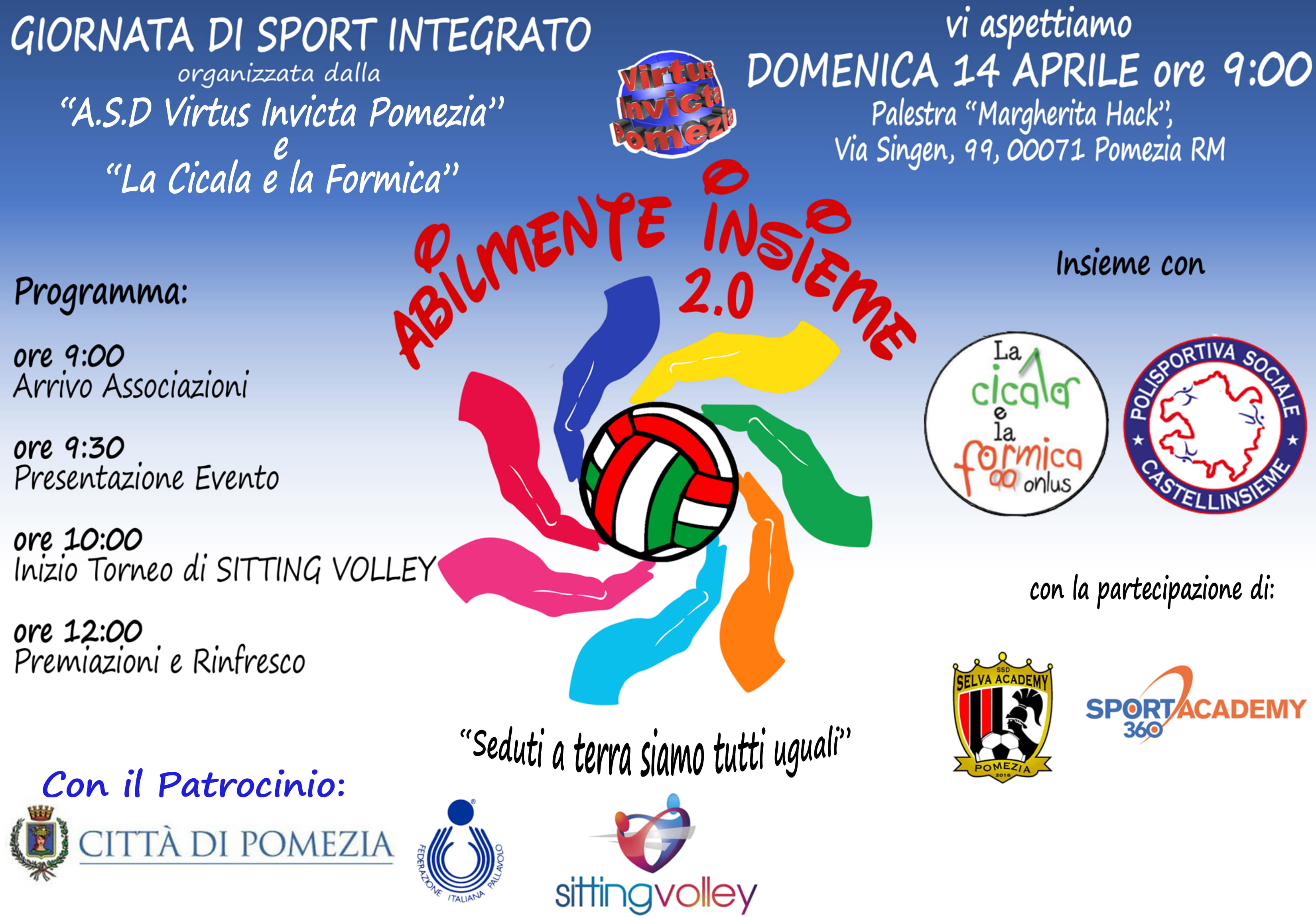 Domenica 14 aprile a partire dalle 9.00 si terrà l'evento di Sport Integrato Abilmente Insieme 2.0 organizzato ogni anno a Pomezia (Rm) da ASD Virtus Invicta Pomezia e La Cicala e la Formica onlus. L'intento è quello di far vedere ai ragazzi affetti da disabilità intellettiva e relazionale che anche per loro c'è la possibilità di fare sport e che questo potrà aiutarli ad integrarsi e relazionarsi con gli altri attraverso un gioco di squadra. Quest'anno proponiamo‚ anche con la Polisportiva "Castellinsieme"‚ il Sitting Volley "Seduti a terra siamo tutti uguali". Questo gioco oltre che essere una buona occasione per l’avviamento allo sport si rivela altrettanto utile per la socializzazione e sensibilizzazione tra disabili e normodotati. L'associazione ASD Virtus Invicta Pomezia sta elaborando un progetto da proporre all’interno delle scuole e non‚ per promuovere la pratica dello sport da parte di chiunque‚ integrando persone normodotate con disabili‚ cercando di mettere ogni praticante nella stessa condizione‚ enfatizzando il concetto “far sentire la normalità ad un disabile e far percepire la disabilità ad un normodotato”‚ impedendo l’isolamento e sensibilizzando l’integrazione tra le due categorie. Lo sport in generale‚ e questo nuovo sport in particolare‚ possono favorire la crescita di ognuno‚ specialmente in persone con disabilità‚ dando loro una nuova speranza oltre al senso di aggregazione e di gruppo‚ facendo passare il “problema” disabilità in secondo luogo‚ a favore della voglia di competere e stare insieme. Per la manifestazione è realizzata in collaborazione con l'Associazione Sport Academy 360 che con la sua squadra partecipa al campionato nazionale di Sitting Volley e che per l'occasione parteciperà con un allenatore facendo conoscere meglio questo sport. Inoltre l'associazione intende promuovere questo sport anche alle persone con disabilità fisica in collaborazione con le Azienda Sanitaria Locale‚ Al riguardo per chi vuole mettersi in contatto può scrivere a virtus.invicta.pomezia@gmail.com.