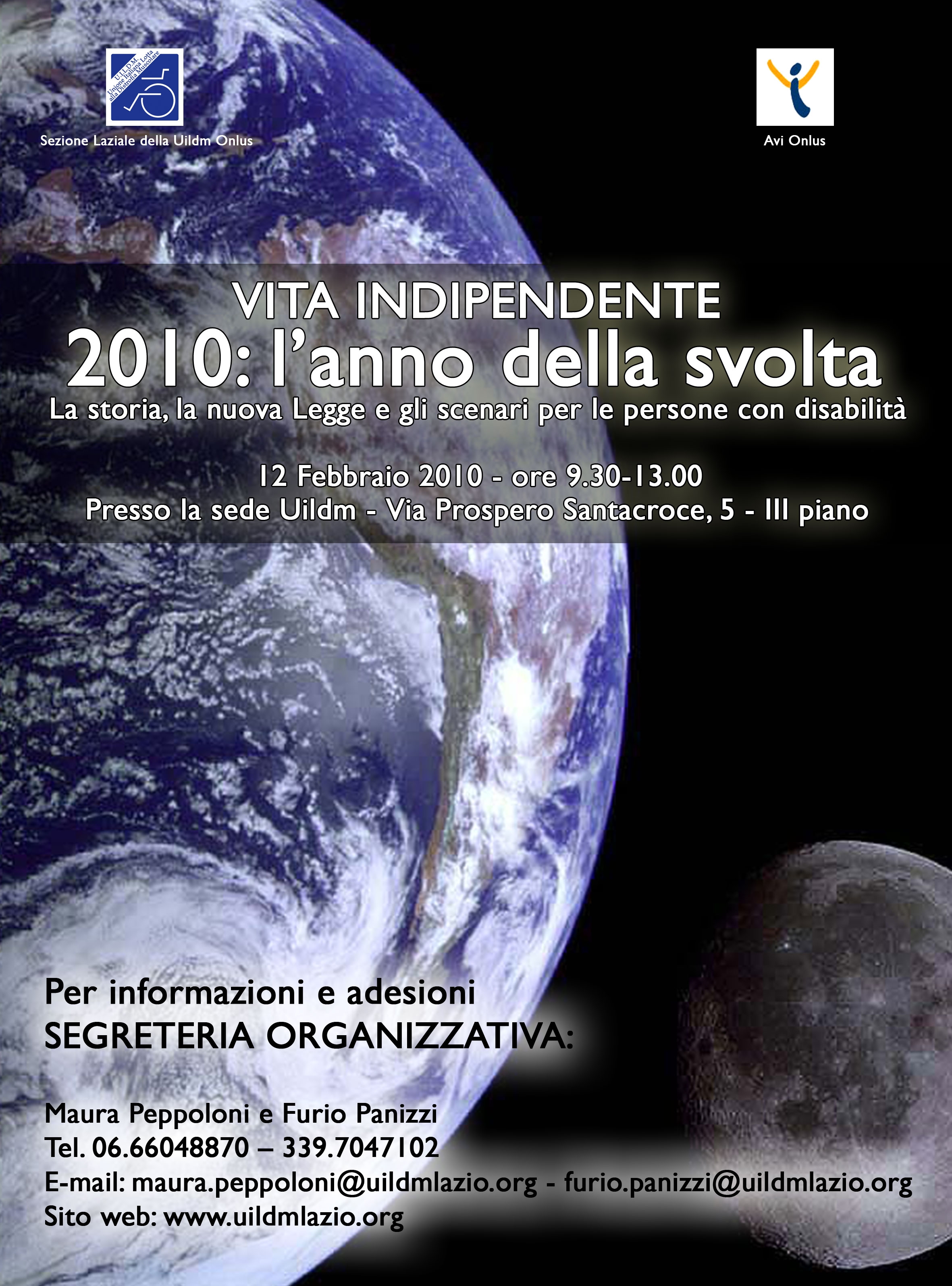 Si svolge venerdì 12 febbraio 2010 dalle ore 9.30 alle 13.00‚ presso la sede Uildm in via Prospero Santacroce 5 il Convegno intitolato 2010: l’anno della svolta. La storia‚ la Legge e gli scenari per le persone con disabilta promosso dalla sezione laziale della Uildm (Unione italiana lotta alla distrofia muscolare) e Avi (Agenzia per la Vita Indipendente).