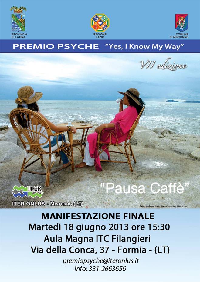 Martedì 18 giugno 2013‚ dalle ore 15.30 alle 19.30‚ presso l’Aula magna dell’Istituto Tecnico Commerciale Filangieri in via della Conca‚ 17 a Formia‚ si svolgerà la premiazione della settima edizione del Premio Psyche pausa caffè.