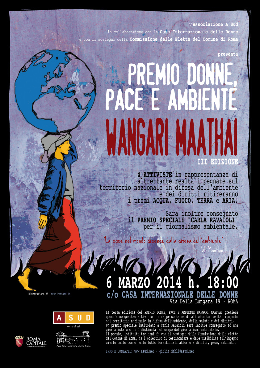 Il Premio Donne‚ Pace e Ambiente Wangari Maathai promosso dall’associazione A Sud giunge alla sua III edizione e invita il 6 marzo 2014 presso la Casa Internazionale delle Donne a Roma‚ in Via della Lungara 19‚ alle ore 18‚ per assistere alla serata finale.