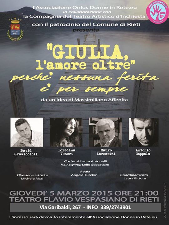 Il ruolo della donna e il tema dell’amore malato al centro dell’attenzione grazie a uno spettacolo teatrale che andrà in scena al Flavio Vespasiano di Rieti il 5 marzo alle ore 21.00. Lo spettacolo che si intitola Giulia‚ l’amore oltre. Perché nessuna ferita è per sempre‚ è stato organizzato dall’associazione Donne in Rete.eu e patrocinata dal Comune di Rieti.