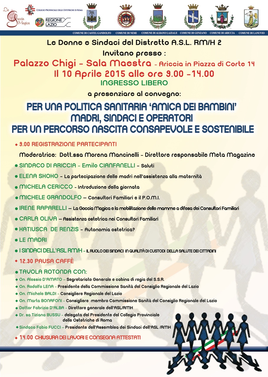 Le Donne e Sindaci del Distretto A.S.L. RM/H 2 e l’associazione La Goccia Magica invitano venerdì 10 Aprile 2015 alle ore 9.00 presso la Sala Maestra di Palazzo Chigi ad Ariccia in Piazza di Corte‚ 14 a presenziare al convegno Per una politica sanitaria Amica dei bambini. Madri‚ sindaci e operatori per un percorso nascita consapevole e sostenibile.