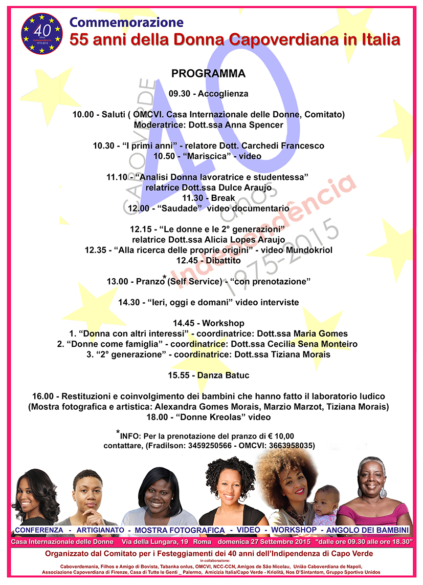 Appuntamento domenica 27 settembre 2015 alle ore 09.30 alle 18.00 presso la Casa Internazionale delle Donne in via della Lungara‚ 19 a Roma (zona Trastevere) per l’evento dal titolo 55 anni della Donna Capoverdiana in Italia. L’incontro‚ organizzato dal Comitato del 40° anno d’indipendenza di Capo Verde‚ in collaborazione con diverse associazioni capoverdiane‚ vuole essere un’occasione di dialogo‚ storia‚ cultura e confronto su questi 55 anni dell’immigrazione capoverdiana in Italia; il programma prevede una conferenza‚ artigianato‚ mostra fotografica‚ video‚ workshop e laboratori ludici per bambini.