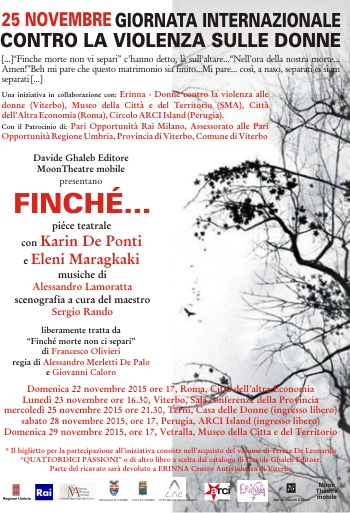 Lunedì 23 novembre 2015‚ in occasione della Giornata internazionale contro la violenza sulle donne‚ l’associazione Erinna Donne contro la violenza alle donne (Viterbo)‚ il Museo della Città e del Territorio (SMA)‚ la Città dell’Altra Economia (Roma) e il Circolo ARCI Island (Perugia) invitano a due iniziative per riflettere e sensibilizzare sulla violenza contro le donne. Alle ore 16.00 andrà in scena FINCHÈ... una piece teatrale che racconta la storia di due donne che vengono uccise dai loro rispettivi compagni. Una denuncia contro il femminicidio scritta da un uomo che si è messo nei panni delle vittime liberamente tratta da Finché morte non ci separi di Francesco Olivieri che vedrà sul palco Karin De Ponti e Eleni Maragkaki con le musiche di Alessandro Lamoratta e la scenografia di Sergio Rando.