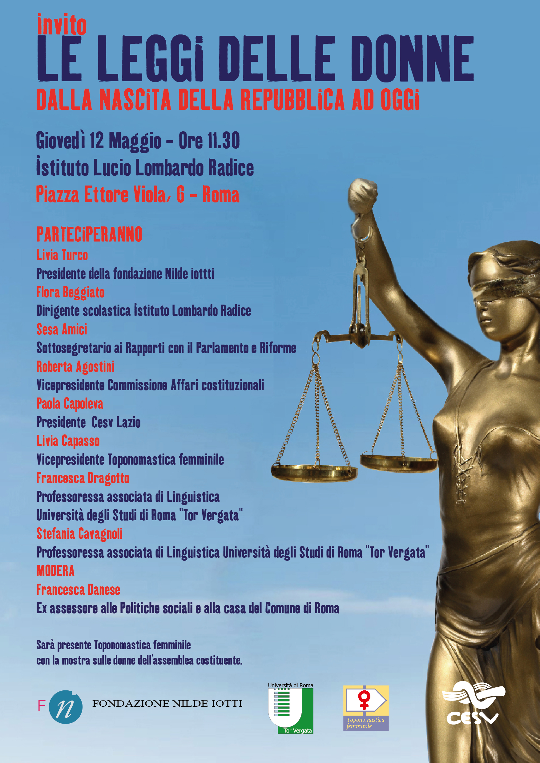 Appuntamento giovedì 12 maggio 2016 dalle ore 11.30 presso l’Istituto Lucio Lombardo Radice in Piazza Ettore Viola‚ 6 a Roma con l’incontro dal titolo Le leggi delle donne. Dalla nascita della Repubblica ad oggi. L’associazione Toponomastica femminile sarà presente con la mostra sulle donne dell’assemblea costituente. Per informazioni comunicazione@cesv.org