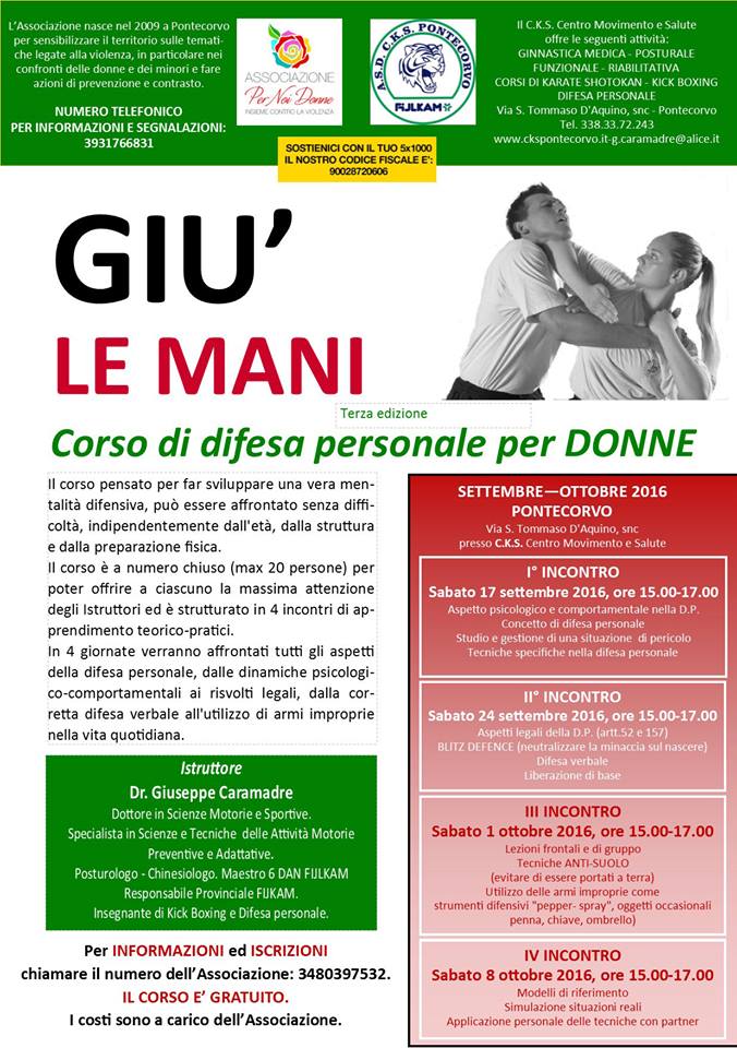 L'associazione per Noi Donne Onlus di Pontecorvo organizza un corso di difesa personale per donne‚ pensato per sviluppare una vera mentalità difensiva. Verranno affrontati tutti gli aspetti della difesa personale‚ dalle dinamiche psicologico-comportamentali ai risvolti legali‚ dalla corretta difesa verbale all'utilizzo di armi improprie nella vita quotidiana. Le quattro lezioni si terranno dal 17 settembre all’8 ottobre 2016 presso il C.K.S. Centro movimento e Salute in Via Tommaso D’Aquino‚ snc a Pontecorvo.