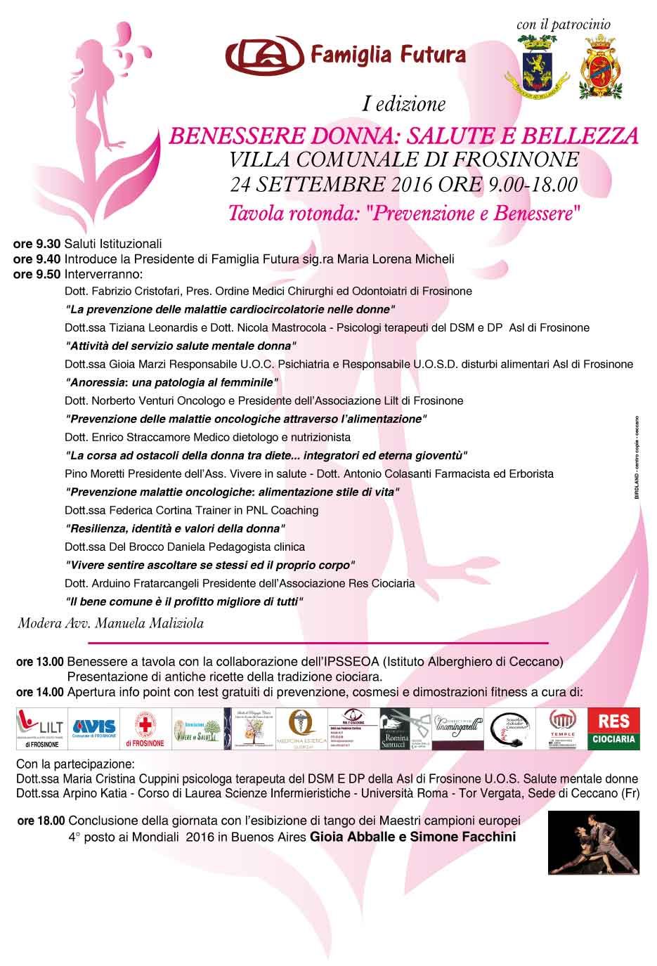 L’associazione Famiglia Futura‚ con il patrocinio del Comune di Frosinone‚ invita alla Ia edizione dell’evento Benessere Donna: salute e bellezza – Tavola rotonda: “Prevenzione e benessere”‚ organizzato per sabato 24 settembre dalle ore 9:30 alle ore 18:00 presso la Villa comunale di Frosinone. Il seminario prevede interventi di specialisti come uno psicologo‚ uno psichiatra‚ un dietologo‚ un nutrizionista‚ una pedagogista‚ un oncologo ed altri. Seguirà una presentazione di piatti tipici ciociari e sarà inoltre a disposizione un info point con test gratuiti di prevenzione‚ cosmesi e dimostrazioni di fitness. Per concludere la giornata‚ grande intrattenimento con un’esibizione di tango.