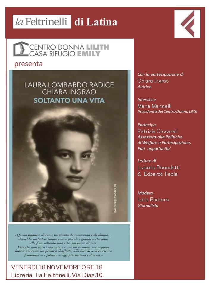 Venerdì 18 novembre alle ore 18:00 presso la libreria Feltrinelli in via Diaz‚ 10 Latina‚ il Centro Donna Lilith e La Casa Rifugio Emily presentano il libro “Soltanto una vita” di Laura Lombardo Radice e Chiara Ingrao. In “Soltanto una vita” (edizioni Baldini & Castoldi) Chiara Ingrao racconta la lunga esperienza di vita della madre‚ Laura Lombardo Radice‚ pubblicandone le lettere‚ gli articoli‚ le interviste‚ gli appunti. A ogni capitolo antepone un proprio «prologo»‚ fatto di ricordi e di riflessioni‚ e fitto di echi di altre voci: un dialogo postumo fra due generazioni di donne che hanno tentato un percorso di libertà‚ per se stesse e per gli altri. Saranno presenti e interverranno nel corso della presentazione: Chiara Ingrao‚ autrice; Maria Marinelli‚ Presidente del Centro Donna Lilith; Patrizia Ciccarelli‚ assessora alle politiche di Welfare e Partecipazione‚ Pari opportunità. Le letture saranno curate da Luisella Benedetti e Eduardo Feola. L’incontro sarà moderato dalla giornalista Licia Pastore.