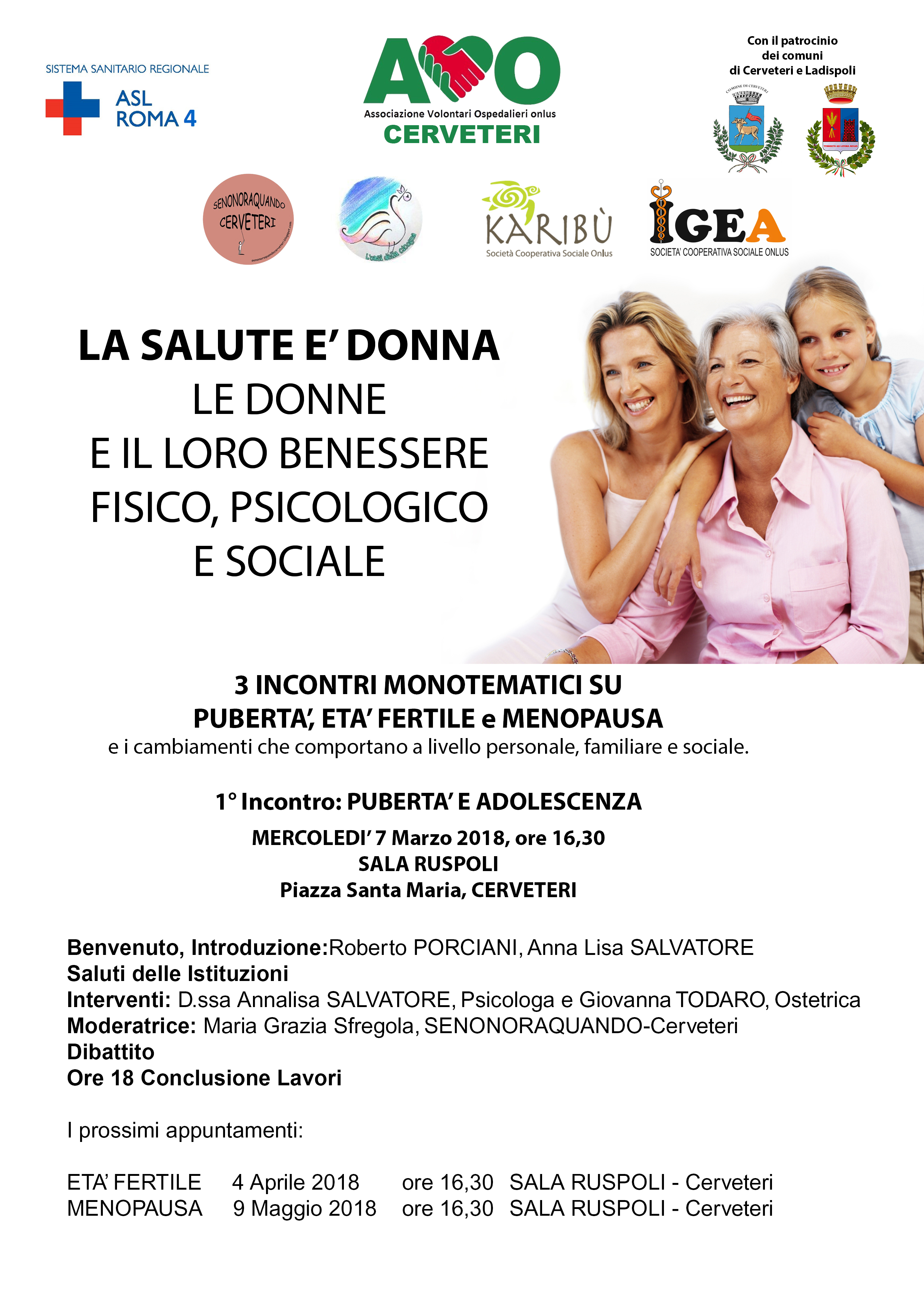 L’iniziativa “La salute è donna” si svolgerà in 3 incontri monotematici su pubertà‚ età infantile e menopausa e i cambiamenti che portano a livello personale‚ familiare e sociale. Il primo incontro si terrà il 7 marzo alle ore 16.30 nella sala Ruspoli in Piazza Santa Maria a Cerveteri e tratterà il tema della pubertà ed adolescenza. Ad aprire l’incontro‚ con i saluti istituzionali‚ saranno: Roberto Porciani e Anna Lisa Salvatore. L’incontro prosegue con gli interventi della Dottoressa Annalisa Salvatore‚ Psicologa e Giovanna Todaro‚ Ostetrica. Gli incontri sono organizzati da AVO‚ Senonoraquando Cerveteri‚ L’Oasi della Cicogna‚ Karibù‚ Igea‚ con il patrocinio dei Comuni di Cerveteri e Ladispoli e della ASL RM 4. I successivi appuntamenti del 4 aprile e del 9 maggio si svolgeranno sempre presso la sala Ruspoli di Cerveteri‚ e verranno approfonditi i temi dell’età fertile e della menopausa.