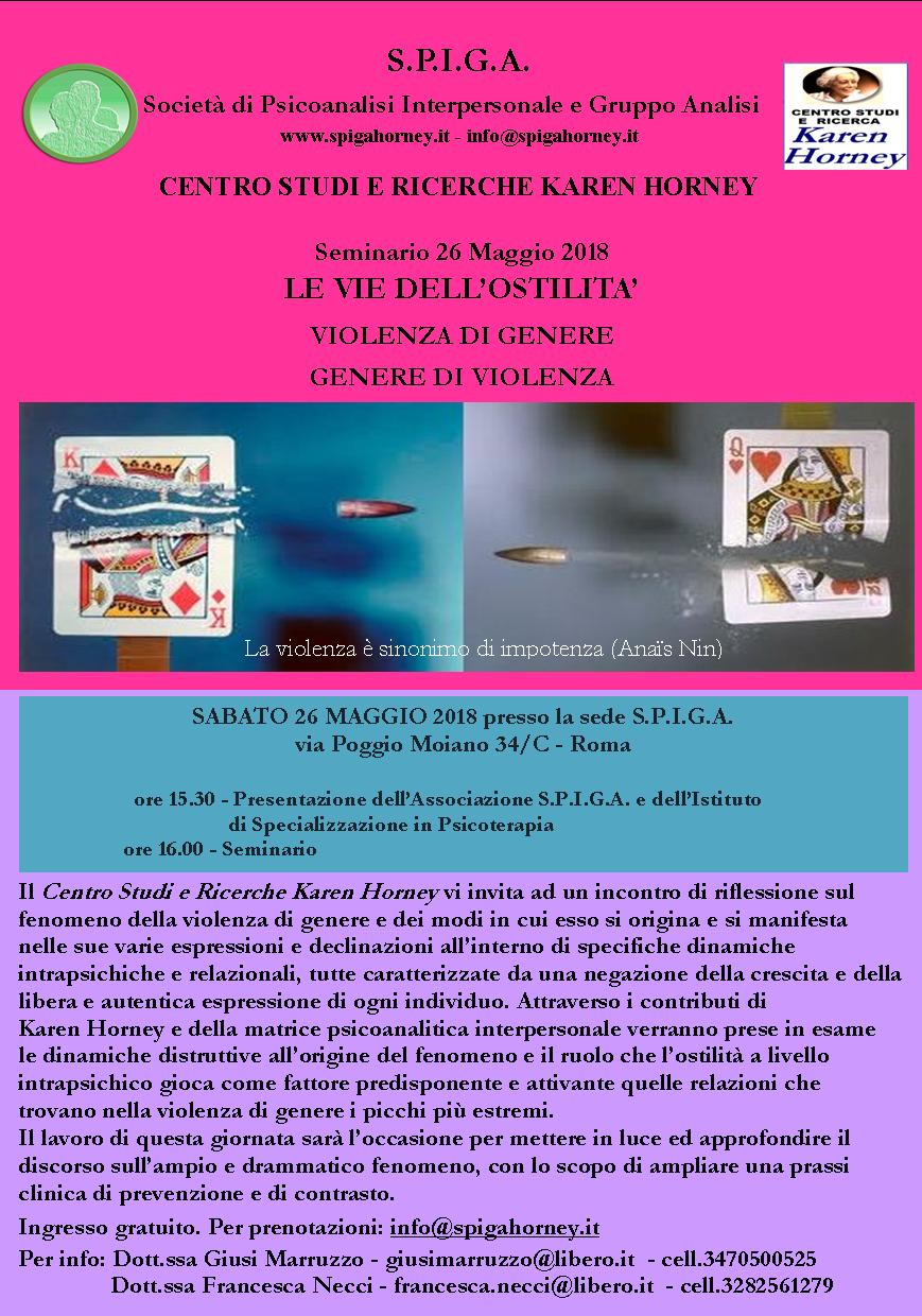 Sabato 26 maggio dalle ore 15.30 si terrà‚ presso la sede della Società di Psicoanalisi Interpersonale e GruppoAnalisi (S.P.I.G.A.) in Via Poggio Moiano 34/C‚ a Roma‚ il seminario dal titolo “Le vie dell’ostilità. Violenza di genere‚ genere di violenza”. Il seminario‚ organizzato dal Centro Studi e Ricerca Karen Horney‚ sarà dedicato al tema della violenza di genere‚ al modo in cui questa si origina e si manifesta nelle sue diverse espressioni‚ nelle dinamiche psichiche personali e di relazione. Verranno‚ quindi‚ approfondite le dinamiche distruttive all'origine del fenomeno e ciò che attiva la violenza di genere con i suoi picchi più estremi. La giornata sarà l’occasione per approfondire il fenomeno‚ con lo scopo di ampliare una prassi clinica di prevenzione e contrasto. Il seminario‚ che avrà inizio alle ore 16.00‚ sarà preceduto‚ alle ore 15.30‚ dalla presentazione dell'associazione e dell'Istituto di Specializzazione in Psicoterapia S.P.I.G.A. Ingresso libero. Per prenotare: info@spigahorney.it