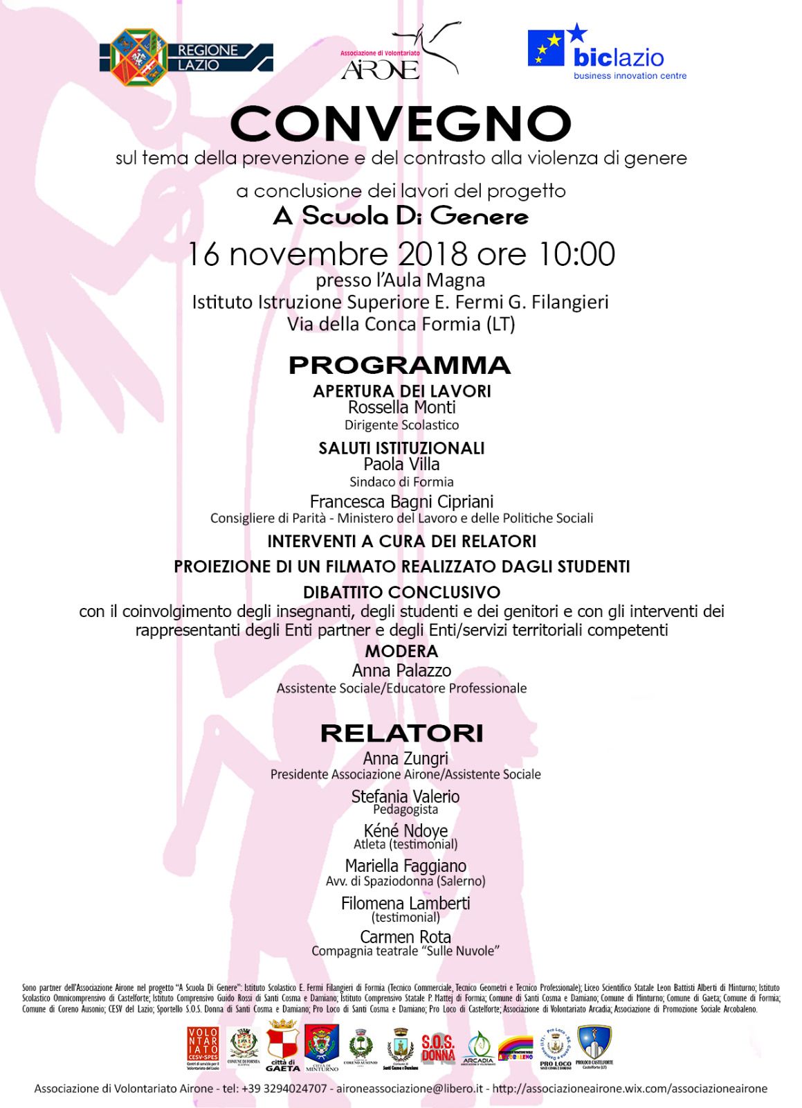 Venerdì 16 Novembre 2018 alle 10.00 l’associazione Airone organizza un convegno su prevenzione e contrasto della violenza di genere. L’appuntamento è presso l’Aula Magna dell’IIS “E. Fermi G. Filangieri” di Formia (LT)‚ in Via della Conca. Il convegno si pone a conclusione del progetto A Scuola Di Genere‚ che nasce per contrastare la violenza sulle donne: attraverso incontri organizzati in sette istituti scolastici del Distretto Formia-Gaeta‚ intende dare agli studenti gli strumenti necessari per capire il fenomeno della violenza di genere‚ mettendoli nelle condizioni di rimuovere pregiudizi e stereotipi alla base di comportamenti discriminatori‚ che possono sfociare nella violenza. Il convegno del 16 Novembre vuole essere un momento di sensibilizzazione sul tema‚ promuovere sinergie tra soggetti pubblici‚ privati e del terzo settore‚ educare al rispetto delle differenze e all’acquisizione di modelli relazionali sani e responsabili.