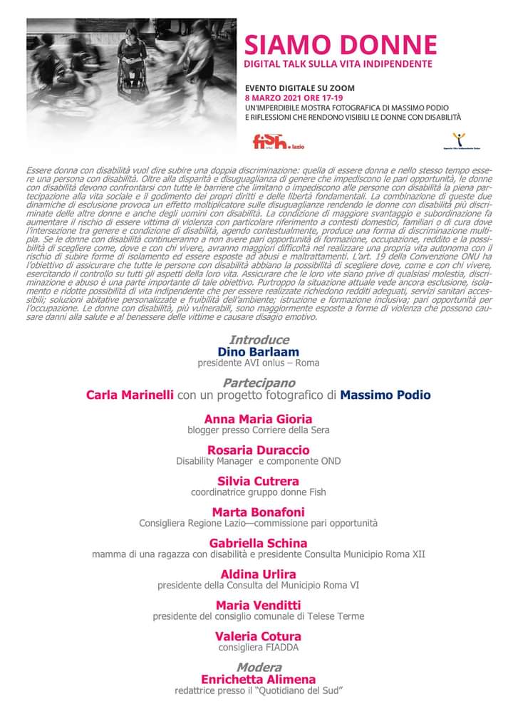 L'Agenzia per la Vita Indipendente onlus organizza un Digital Talk dal titolo Siamo Donne. Si parlerà di disabilità e vita indipendente attraverso l'imperdibile mostra fotografica di Massimo Podio che rende visibili le donne con disabilità. L'evento digitale si terrà sulla piattaforma Zoom lunedì 8 marzo dalle 17.00 alle 19.00. Clicca qui per iscriverti all'incontro.