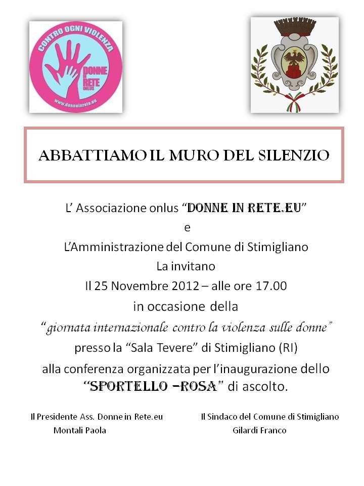 Domenica 25 novembre 2012‚ in occasione della Giornata internazionale contro la violenza sulle donne‚ l’associazione Donne in Rete.eu onlus e l’amministrazione comunale di Stimigliano invitano all’inaugurazione dello Sportello Rosa di ascolto del territorio.