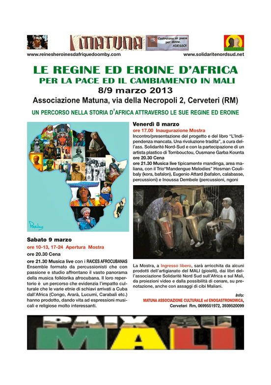 L’associazione Solidarité Nord Sud impegnata nel sostegno alla lotta del popolo maliano per il ritorno della Pace in Mali‚ invita all’evento dal titolo Le Regine ed Eroine d’Africa per la Pace ed il cambiamento in Mali.