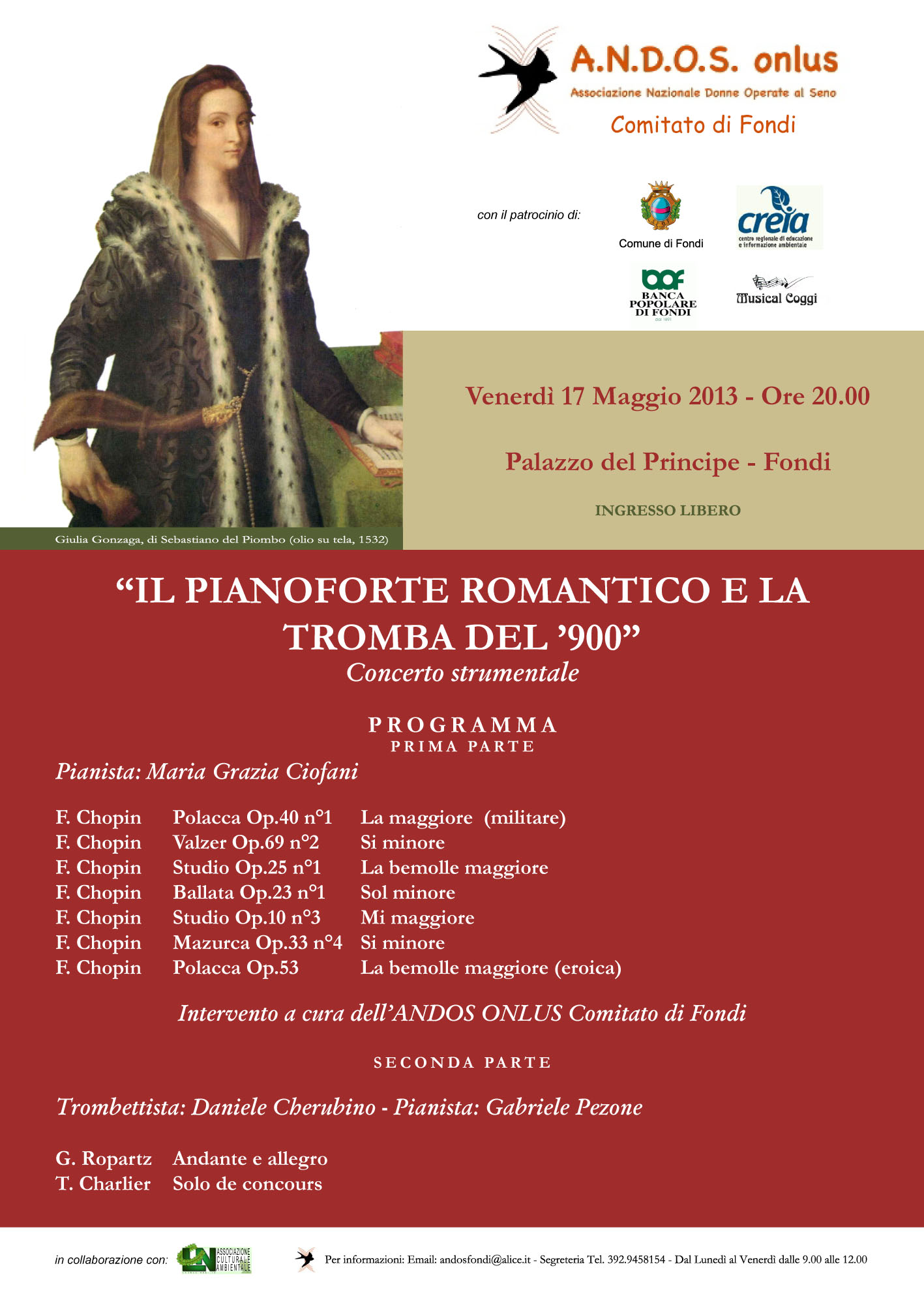 L’associazione A.N.D.O.S Onlus‚ Comitato di Fondi invita al concerto strumentale Il pianoforte romantico e la tromba del ’900.