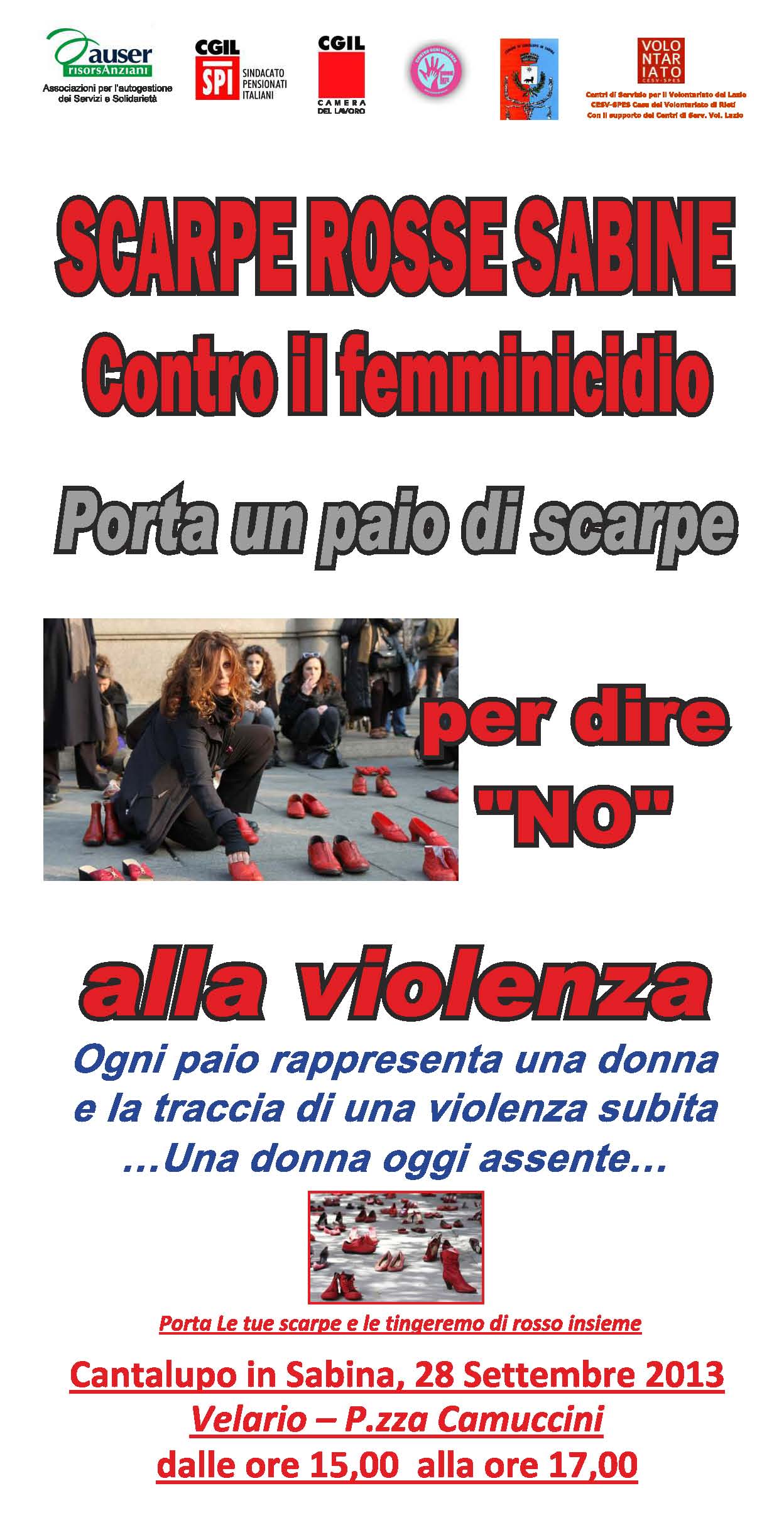 Sabato 28 settembre 2013‚ la Sabina aderisce alla campagna nazionale Scarpe rosse in cammino contro il femminicidio. Auser‚ Cgil‚ Spi Cgil‚ Donne in Rete EU‚ Comune di Cantalupo in Sabina e Centri di Servizio per il Volontariato del Lazio CESV e SPES‚ promotori della tappa in Sabina‚ invitano a portare un paio di scarpe rosse al velario di Piazza Camuccini a Cantalupo in Sabina‚ dalle ore 15.00 alle 17.00‚ per dire NO alla violenza contro le donne.