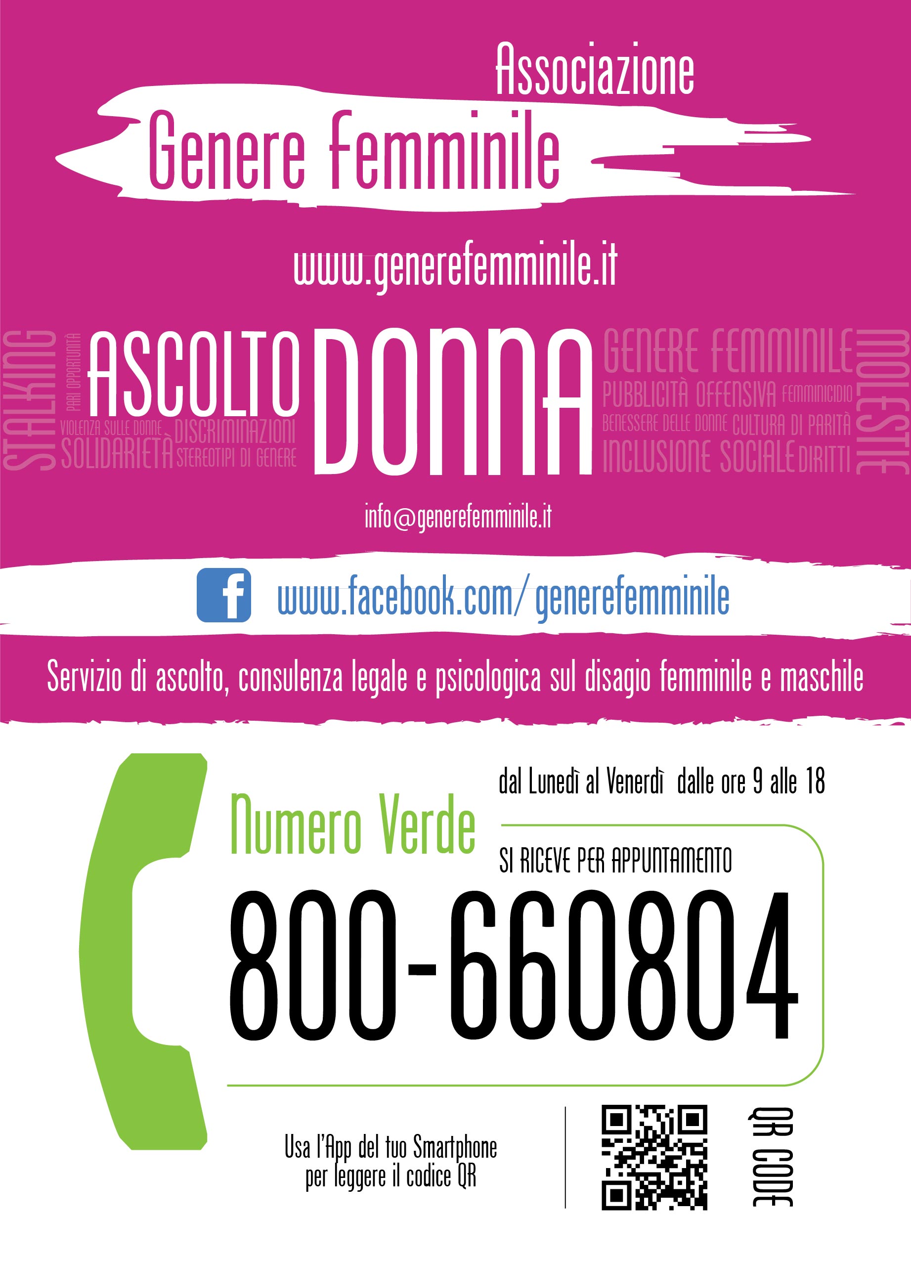 Ascolto donna è il nome del servizio gratuito di ascolto‚ consulenza legale e psicologica sul disagio femminile e maschile dell’Associazione Genere Femminile.
