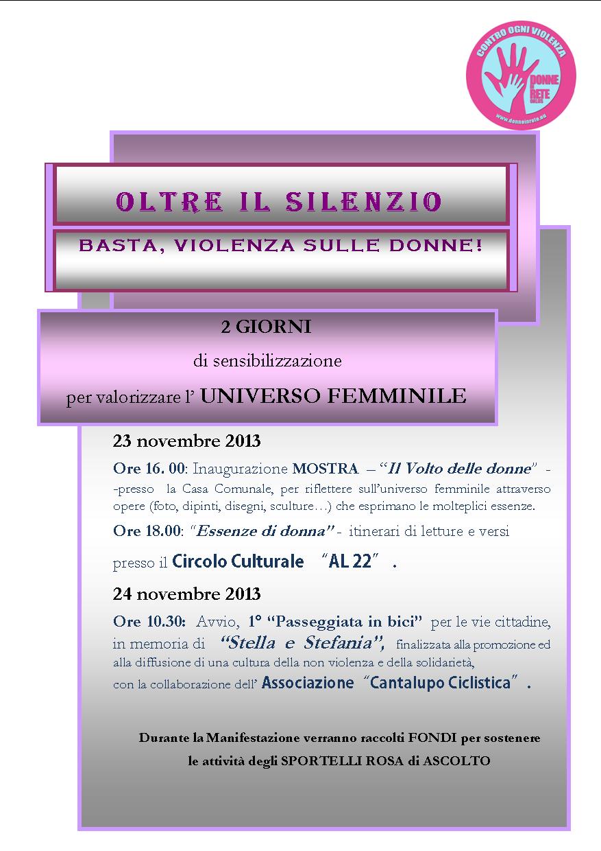 L’associazione Donne in rete. EU - contro ogni violenza‚ in occasione della giornata internazionale per l’eliminazione della violenza sulle donne organizza‚ per sabato 23 e domenica 24 novembre 2013 a Cantalupo in Sabina‚ due giornate di sensibilizzazione al tema dal titolo Oltre il silenzio.