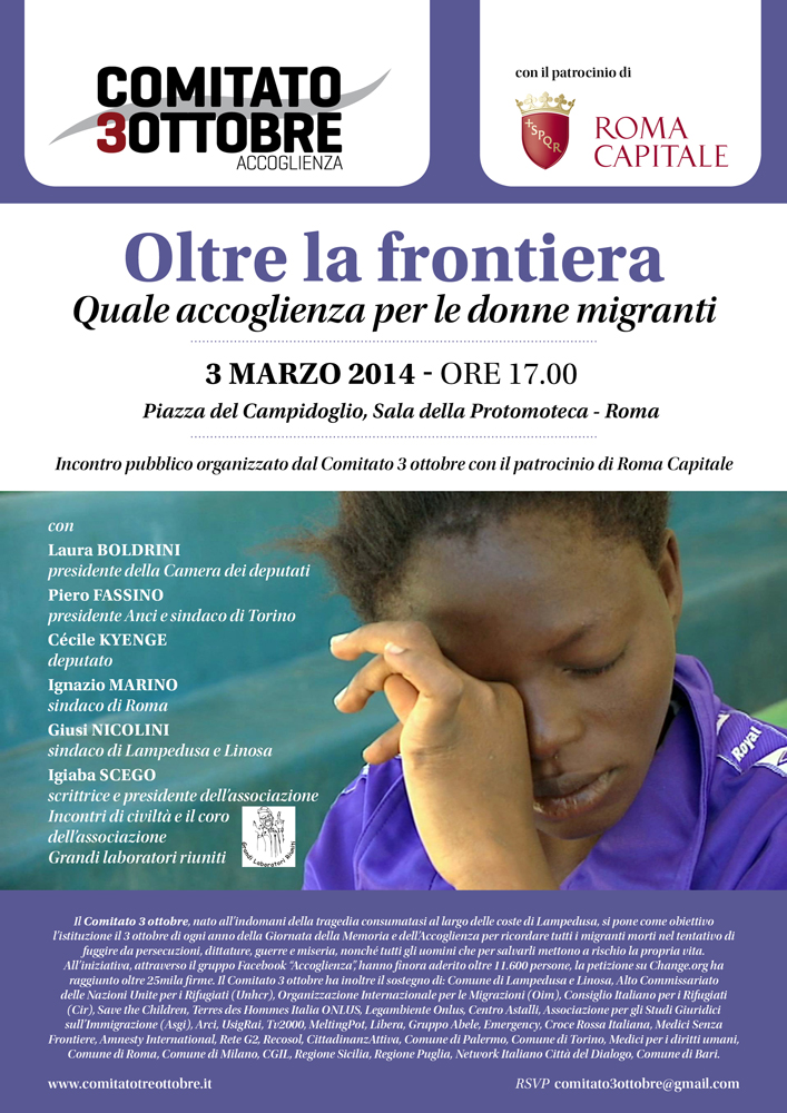 Il Comitato 3 ottobre organizza a Roma per il prossimo 3 marzo un incontro pubblico dal titolo Oltre la frontiera. Quale accoglienza per le donne migranti. L’appuntamento‚ realizzato con il patrocinio di Roma Capitale si svolgerà presso la Sala della Protomoteca in Piazza del Campidoglio a Roma‚ dalle ore 17.00.