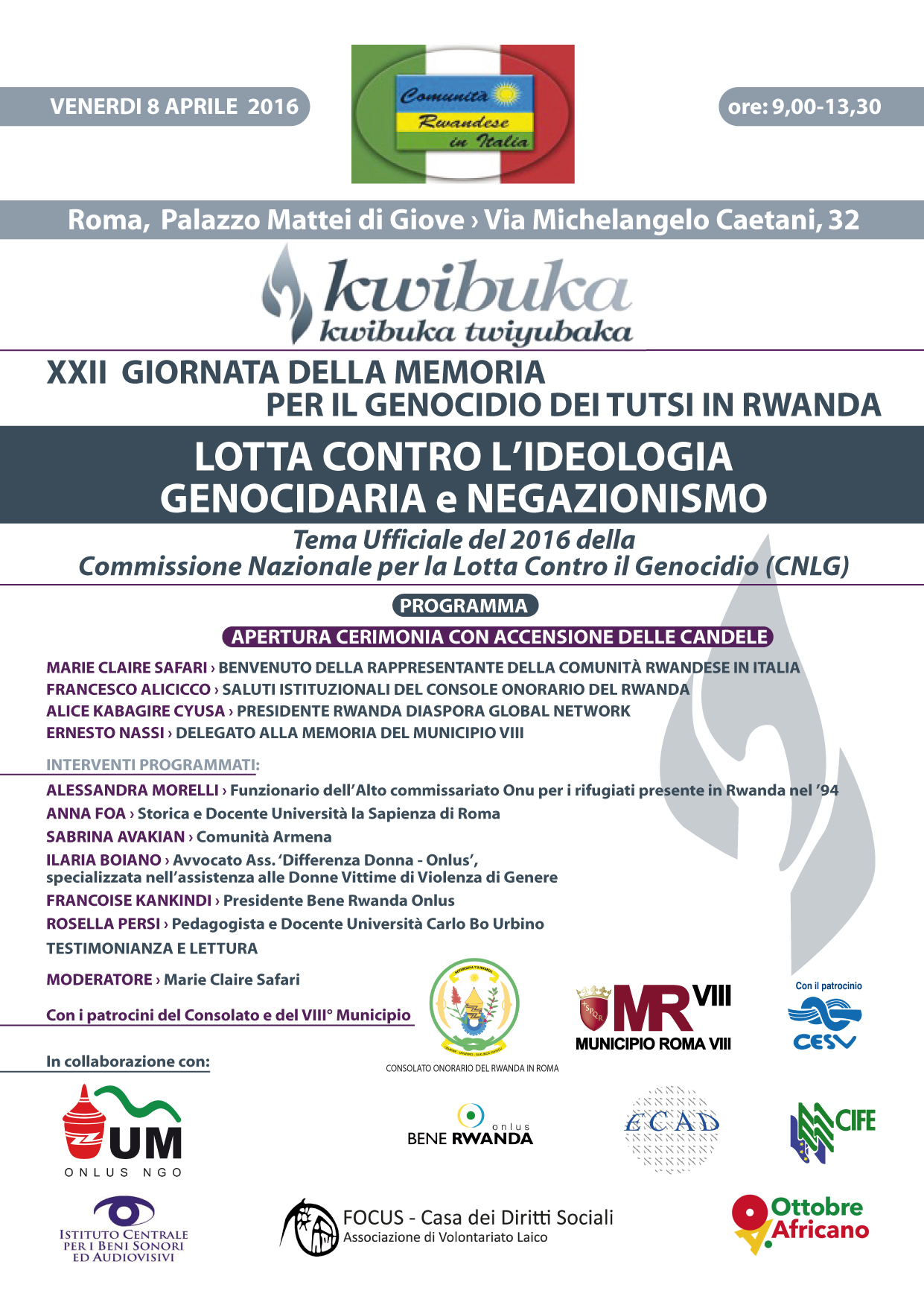 In occasione della XXII Giornata della Memoria per il Genocidio dei Tutsi in Rwanda‚ la comunità Rwandese in Italia invita venerdì 8 aprile 2016 al convegno dal titolo Lotta contro l’ideologia genocidaria e negazionismo. L’incontro viene organizzato in memoria dell'estate del 1994‚ quando in Rwanda si consumava una delle più grandi tragedie umanitarie dell'ultimo secolo: un milione di cittadini Tutsi e Hutu moderati venivano trucidati dagli estremisti appartenenti alla maggioranza Hutu.