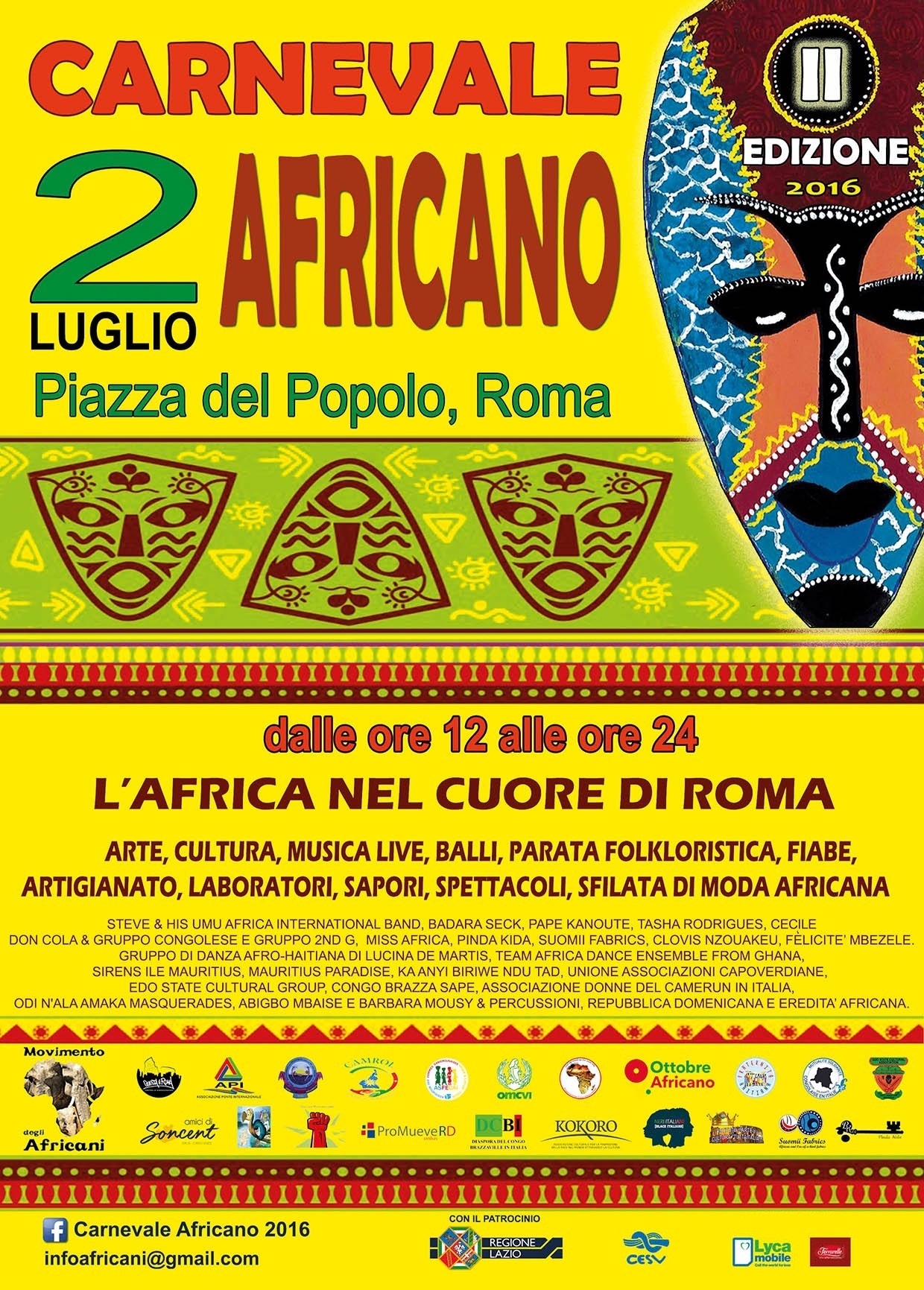Sabato 2 luglio 2016 a piazza del Popolo si terrà la seconda edizione del Carnevale Africano di Roma‚ promosso dall’associazione Movimento degli Africani in collaborazione con numerose altre associazioni. La manifestazione‚ organizzata con il patrocinio della Regione Lazio e il supporto del CESV Lazio‚ avrà inizio alle ore 12.00 e andrà avanti per tutta la giornata fino a mezzanotte.
