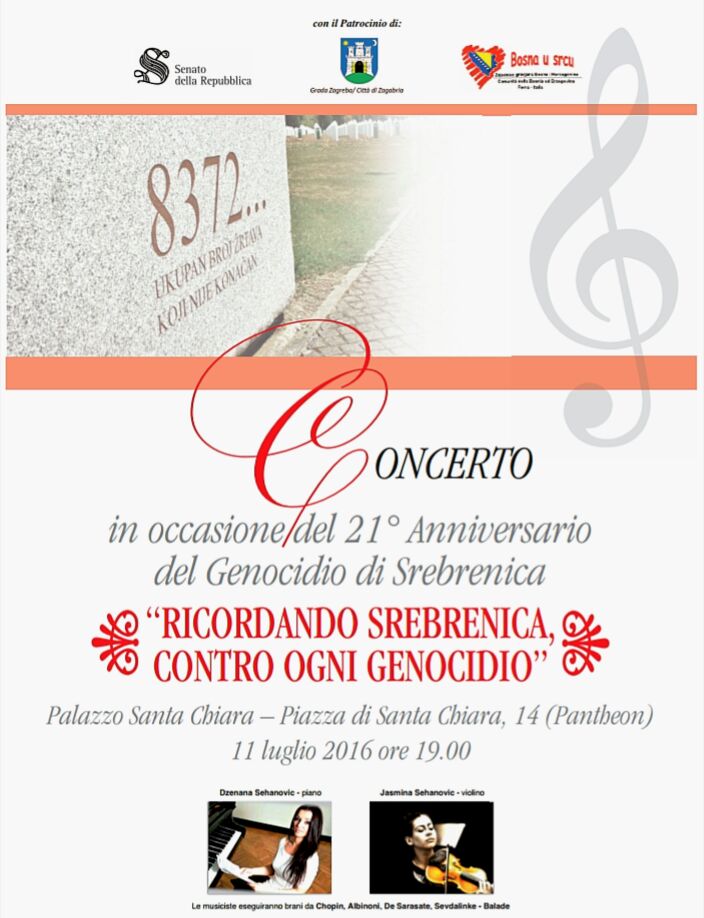 La comunità di Bosnia ed Erzegovina di Roma invita alla Commemorazione del Genocidio di Srebrenica il giorno lunedì 11 luglio. L’evento è di fondamentale importanza per rinnovare la commemorazione dei tragici fatti di Srebrenica avvenuti 21 anni fa‚ per rievocare il dolore e il senso di impotenza e di abbandono vissuto dalla popolazione di Bosnia ed Erzegovina e per ricordare alle coscienze d’Europa la responsabilità della protezione degli indifesi che si affacciano ai nostri confini pieni di speranza. Sarà inoltre un incontro di riflessione e discussione al quale parteciperanno personalità di alto profilo istituzionale‚ così come referenti della comunità di Bosnia ed Erzegovina e delle associazioni ad essa legate. Non è superfluo ricordare che le disposizioni della risoluzione P6-TA (2009) 0028 Srebrenica‚ approvata il 15 gennaio 2009 dal Parlamento Europeo‚ invitavano “il Consiglio e la Commissione a commemorare degnamente l'anniversario del genocidio di Srebrenica-Potocari‚ sostenendo la proposta del Parlamento di proclamare l'11 luglio giorno di commemorazione del genocidio di Srebrenica nell'intera Unione europea” ed invitavano “tutti i paesi dei Balcani occidentali a fare altrettanto”. Le celebrazioni avranno inizio con una conferenza dal titolo “Srebrenica. Per non dimenticare” che si terrà alle ore 15.00 presso la Sala Aldo Moro - Camera dei deputati (Ingresso Principale di Palazzo Montecitorio) e seguiranno alle ore 19.00 con un concerto di musica classica presso la sala Santa Chiara in piazza Santa Chiara‚ 14 a Roma.