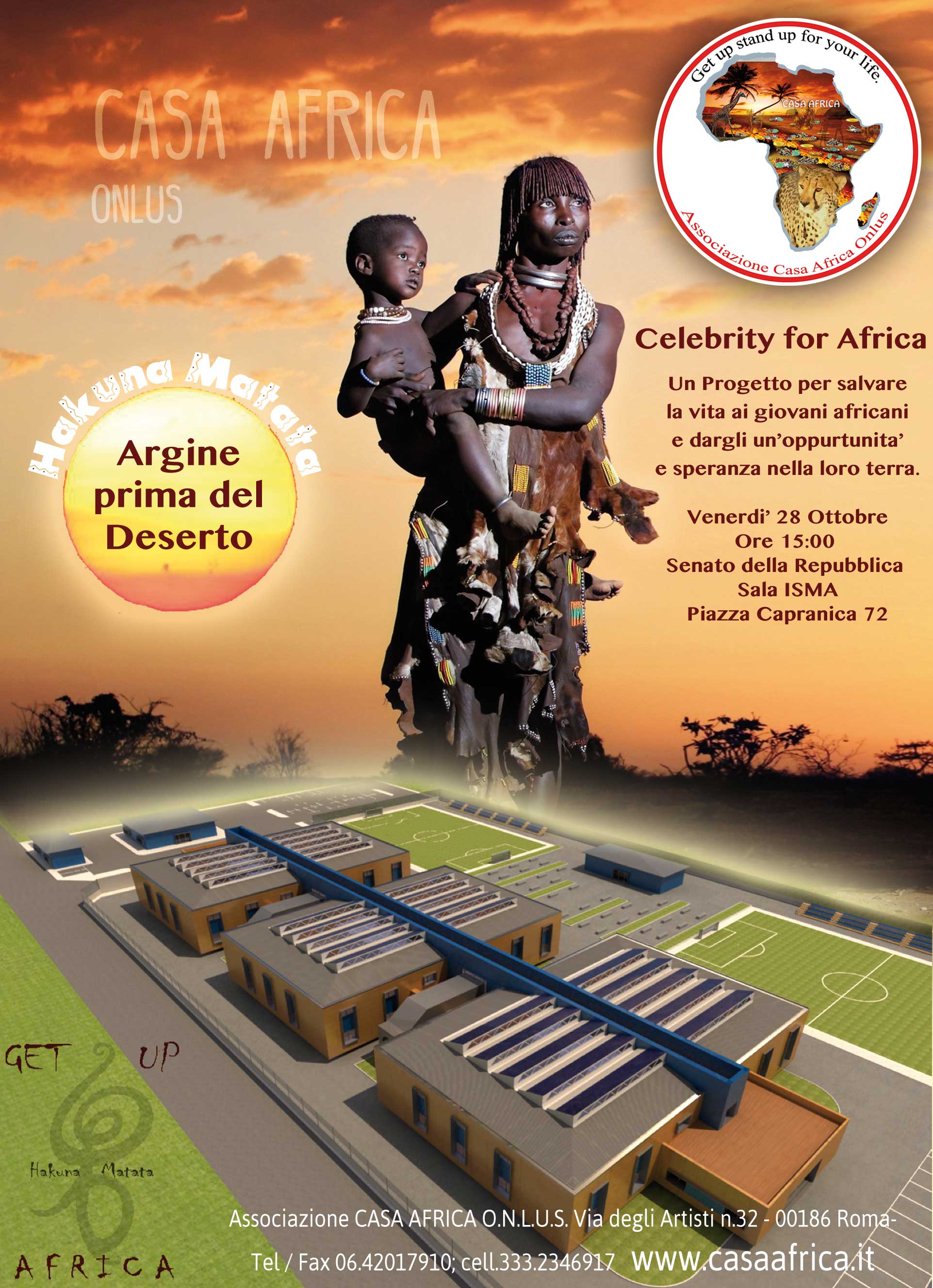 Casa Africa onlus‚ un’associazione di solidarietà e promozione sociale impegnata da molti anni in attività d’informazione diretta alle popolazioni africane‚ invita all’iniziativa dal titolo Argine prima del deserto - Celebrity for Africa. Durante l’incontro srà presentato un il progetto “Hakuna Matata. Argine prima del deserto” che si propone di salvare la vita ai giovani africani e dargli un’opportunità e speranza nella loro terra.