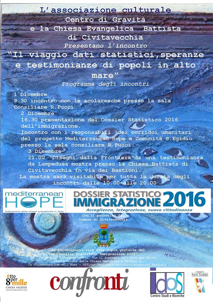 L’associazione Culturale Centro di Gravità e la Chiesa Evangelica Battista di Civitavecchia‚ con il patrocinio del Comune di Civitavecchia‚ presentano l’evento “ Il viaggio dati statistici‚ speranze e testimonianze di popoli in alto mare”. Una serie di incontri che si terranno nel mese di dicembre 2016: Giovedì 1° dalle ore 9:30‚ incontro con le scolaresche presso la Sala Consiliare R. Pucci Venerdì 2 dalle ore 16:30‚ presentazione del Dossier Statistico Immigrazione 2016 Sabato 3 dalle ore 21:00‚ “Disegni dalla frontiera” da una testimonianza di Lampedusa Presso la Chiesa Battista di Civitavecchia (RM) sarà inoltre allestita una mostra visitabile per tutta la durata degli incontri dalle ore 10.00 alle ore 20.00. Ai partecipanti sarà data una copia gratuita del Dossier Statistico Immigrazione 2016