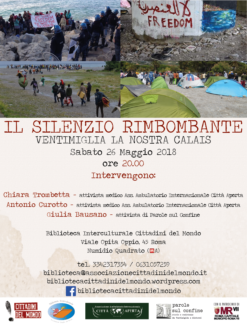 Si terrà sabato 26 Maggio alle ore 20.00 presso la Biblioteca Interculturale Cittadini del Mondo in Viale Opita Oppio‚ 45 a Roma il secondo appuntamento dell'iniziativa "Il Silenzio Rimbombante" organizzato dall'associazione Cittadini del Mondo. In quest'occasione si parlerà di Ventimiglia e si ascolteranno le testimonianze di AA ICA Associazione Ambulatorio Internazionale Città Aperta che ha fornito assistenza ai migranti respinti dalla Francia e di Parole sul Confine un blog che narra i conflitti che si intrecciano e si moltiplicano a partire da questo confine.