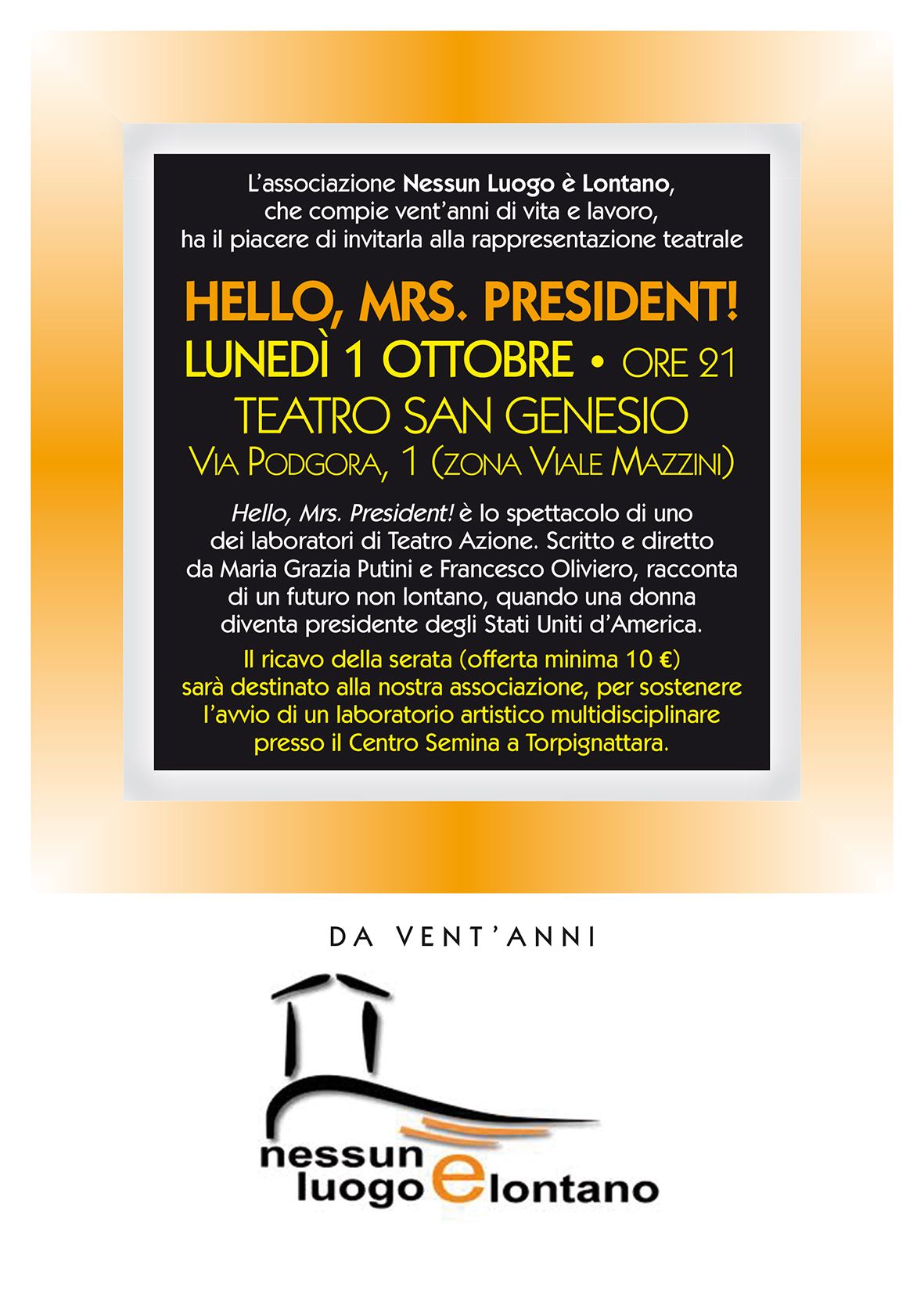 L’associazione Nessun Luogo è Lontano compie vent’anni di vita e di lavoro nelle periferie e per l’integrazione dei migranti. Per festeggiare invita a teatro‚ alla messa in scena di “Hello‚ Mrs President!”‚ che racconta di un futuro non molto lontano‚ in cui Presidente degli Stati Uniti d’America è una donna. L’appuntamento è per lunedì 1 ottobre‚ alle ore 21.00 al Teatro San Genesio in via Podgora‚ 1 a Roma. Hello‚ Mrs President! è lo spettacolo di chiusura di uno dei laboratori di Teatro Azione‚ la Scuola di formazione per attrici e attori diretta da Isabella Del Bianco e fondata‚ più di trenta anni fa‚ con Cristiano Censi. È scritto e diretto da Maria Grazia Putini e Francesco Oliviero e racconta come‚ durante la festa in onore della presidente‚ alcune infelicità‚ molte frustrazioni‚ un po’ di irritazioni e le poche speranze di quelli che partecipano si scontrano con l’improvviso arrivo di un marziano. Un piccolo gruppo di umani confusi e indispettiti finirà per seguire l’alieno tra le stelle‚ pur di non rimanere sulla Terra per renderla migliore. Il lavoro di Teatro Azione si propone di invitare alla riflessione e alla presa di coscienza‚ attraverso storie paradossali e grottesche che coinvolgono gli spettatori‚ quasi anche loro fossero in quel momento sul palcoscenico. Il ricavo della serata (offerta minima 10€) sarà destinato all’Associazione Nessun luogo è lontano‚ per sostenere l’avvio di un laboratorio artistico multidisciplinare presso il Centro Semina a Torpignattara. L’associazione Nessun luogo è lontano‚ dal 1998‚ si batte a fianco degli ultimi per provare ad intervenire sul grande tema dell’immigrazione e sulla epocale richiesta di aiuto da parte di chi non ha avuto la fortuna di nascere da questa parte del mondo. Per informazioni e prenotazioni: tel. 377.1600079