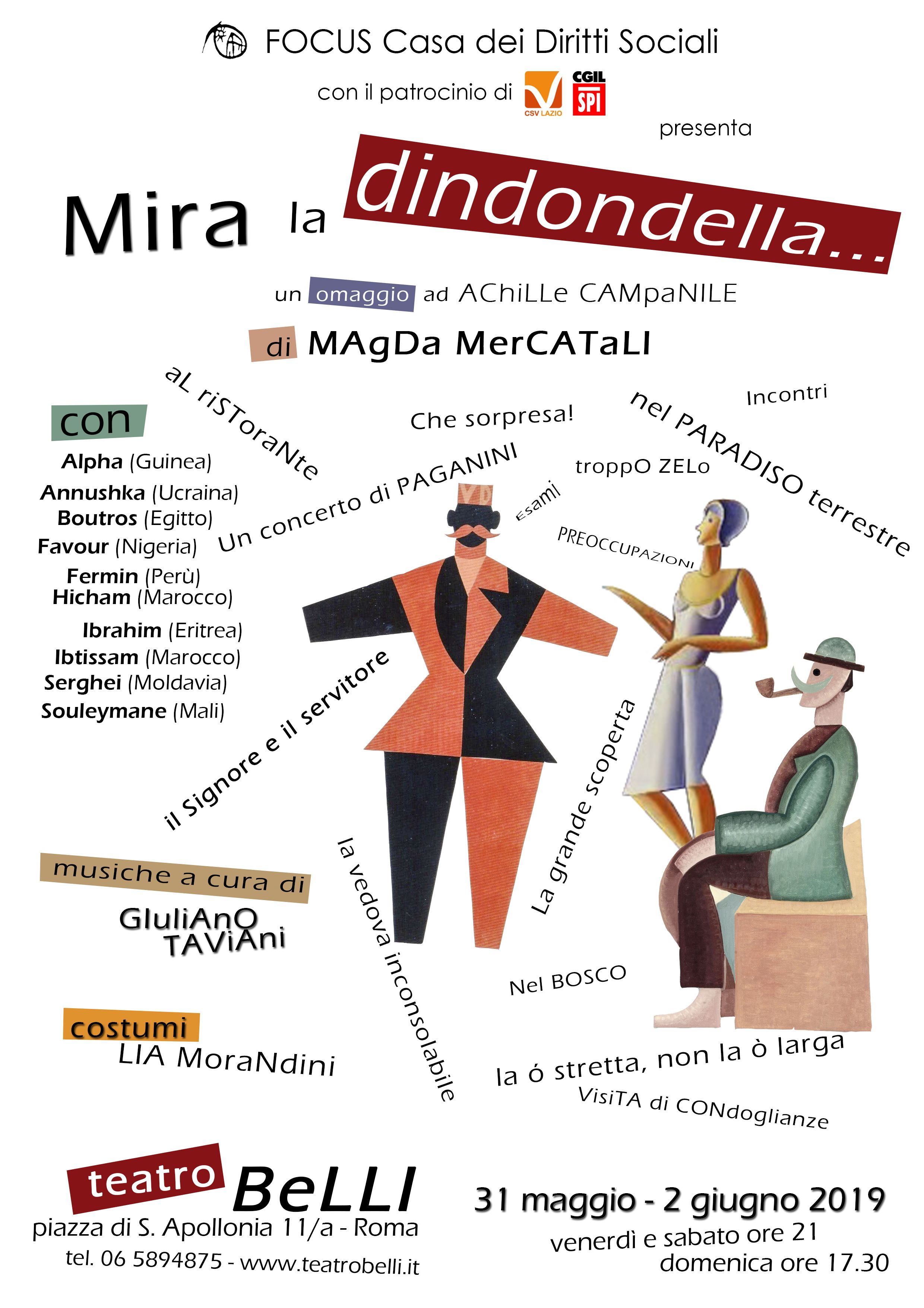 FOCUS - Casa dei Diritti Sociali di Roma realizzerà‚ al termine di un laboratorio teatrale con gli studenti immigrati della scuola di italiano dell'associazione durata 5 mesi‚ 3 spettacoli conclusivi presso il Teatro Belli di Roma in Piazza di S. Apollonia‚ 11/a. Lo spettacolo‚ realizzato con il patrocinio del CSV Lazio e della CGIL SPI‚ si intitola Mira la dindondella...‚ un omaggio ad Achille Campanile con la regia di Magda Mercatali. Le serate si terranno venerdì 31 maggio e sabato 1 giugno alle ore 21.00 e domenica 2 giugno alle ore 17.30. Il laboratorio teatrale è un'iniziativa portata avanti per il sesto anno consecutivo che dà risultati eccellenti oltre che sul piano dell'apprendimento della lingua‚ soprattutto rispetto alla socializzazione e all'ampliamento della sfera relazionale‚ favorendone il sempre difficile processo di inclusione sociale.