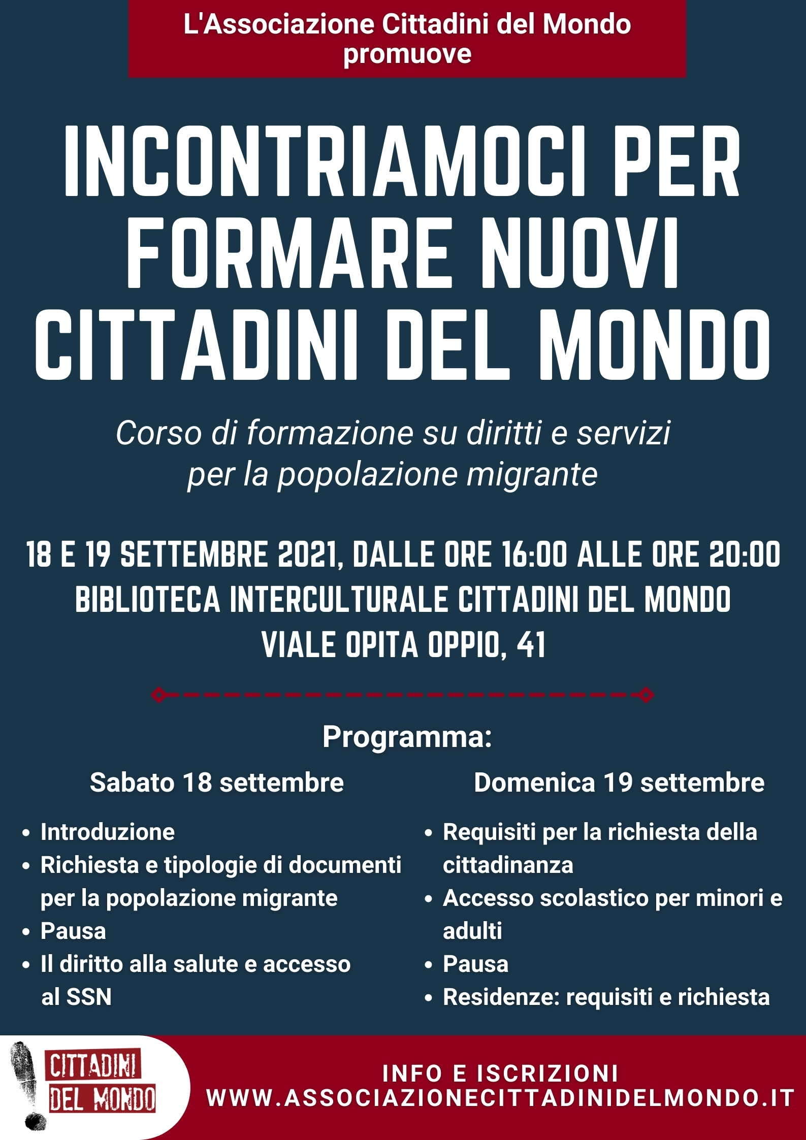 Il 18 e 19 settembre si terranno‚ dalle ore 16 alle ore 20‚ presso la Biblioteca Interculturale Cittadini del Mondo (V.le Opita Oppio‚ 41)‚ due giornate di formazione a cura dell’Associazione “Cittadini del Mondo”. Le due giornate di formazione di “Incontriamoci per formare nuovi Cittadini del Mondo. Corso di formazione su diritti e servizi per la popolazione migrante” saranno rivolte a tutti i volontari dell’Associazione e a tutti i cittadini che sono interessati a fare la loro parte per ridurre il divario sociale e a promuovere l’inclusione‚ per dare un sostegno concreto a persone svantaggiate.