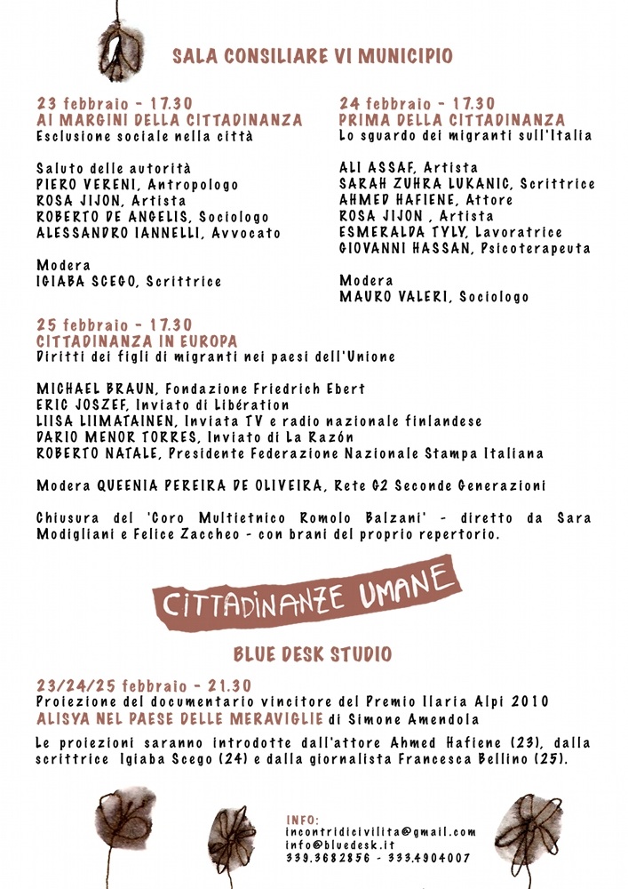 Cosa c’è prima della cittadinanza? Cosa accade ai margini della cittadinanza? Cosa vuol dire essere cittadino migrante nei paesi dell’Unione Europea? Si tiene a Roma la tre giorni dal titolo Cittadinanze Umane‚ dibattiti‚ musica e proiezioni organizzate presso la Sala Consiliare del VI Municipio in piazza della Marranella‚ 2.