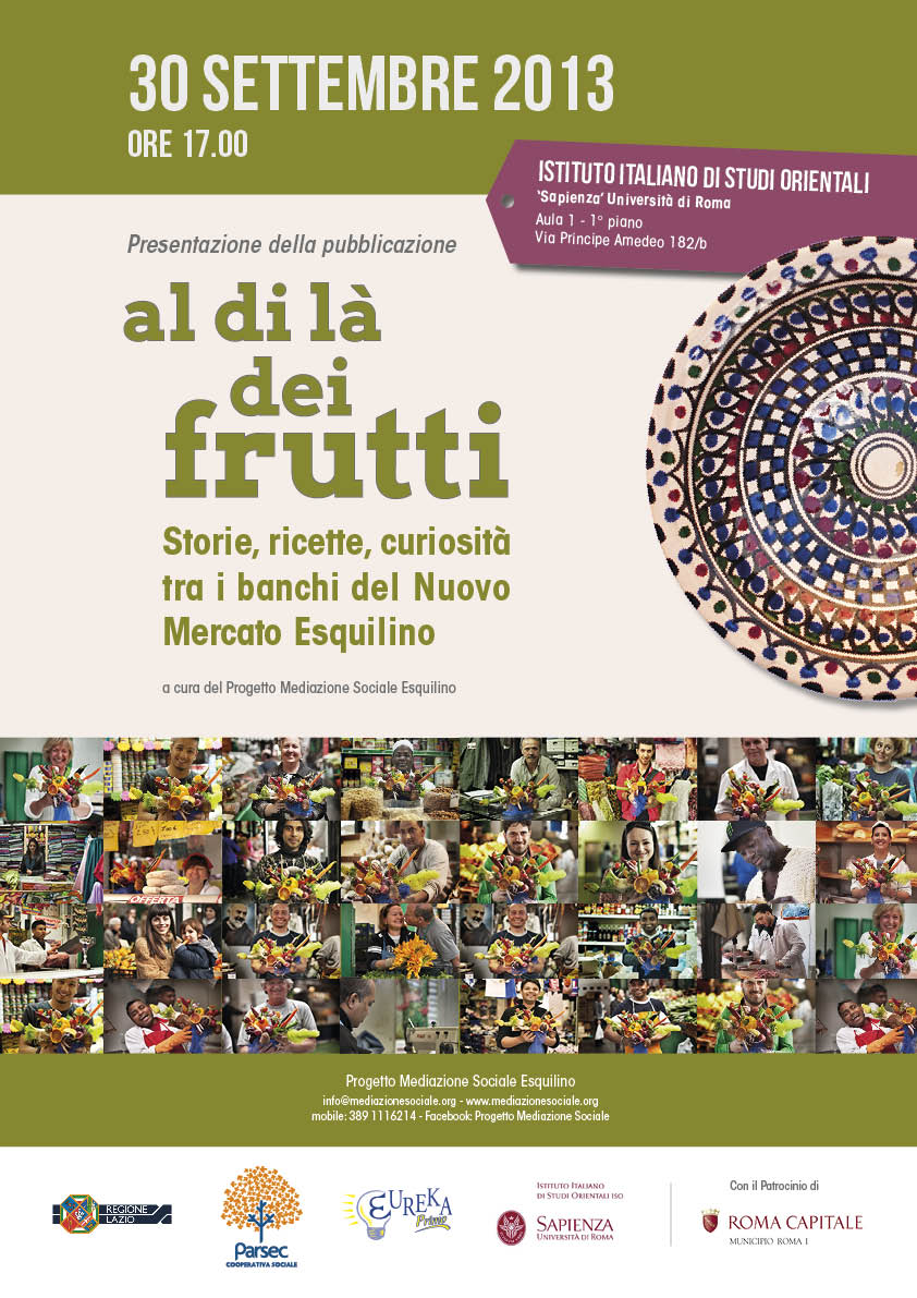 La pubblicazione Al di là dei frutti - storie‚ ricette e curiosità tra i banchi del Nuovo Mercato Esquilino nasce all’interno del Progetto Mediazione Sociale Esquilino‚ gestito dalle Cooperative Parsec ed Eureka Primo Onlus.