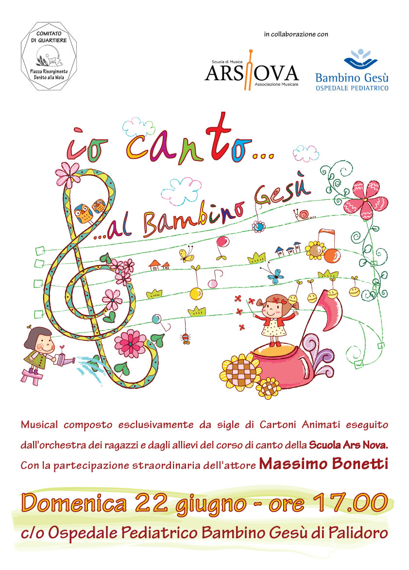 Il Comitato Piazza Risorgimento Derèto della Mola in collaborazione con la scuola di musica Ars Nova e l’Ospedale Bambino Gesù organizzano il concerto Io canto... al Bambino Gesù un musical composto da sigle di cartoni animati eseguito dall’orchestra dei ragazzi e dagli allievi del corso di canto della scuola Ars Nova.