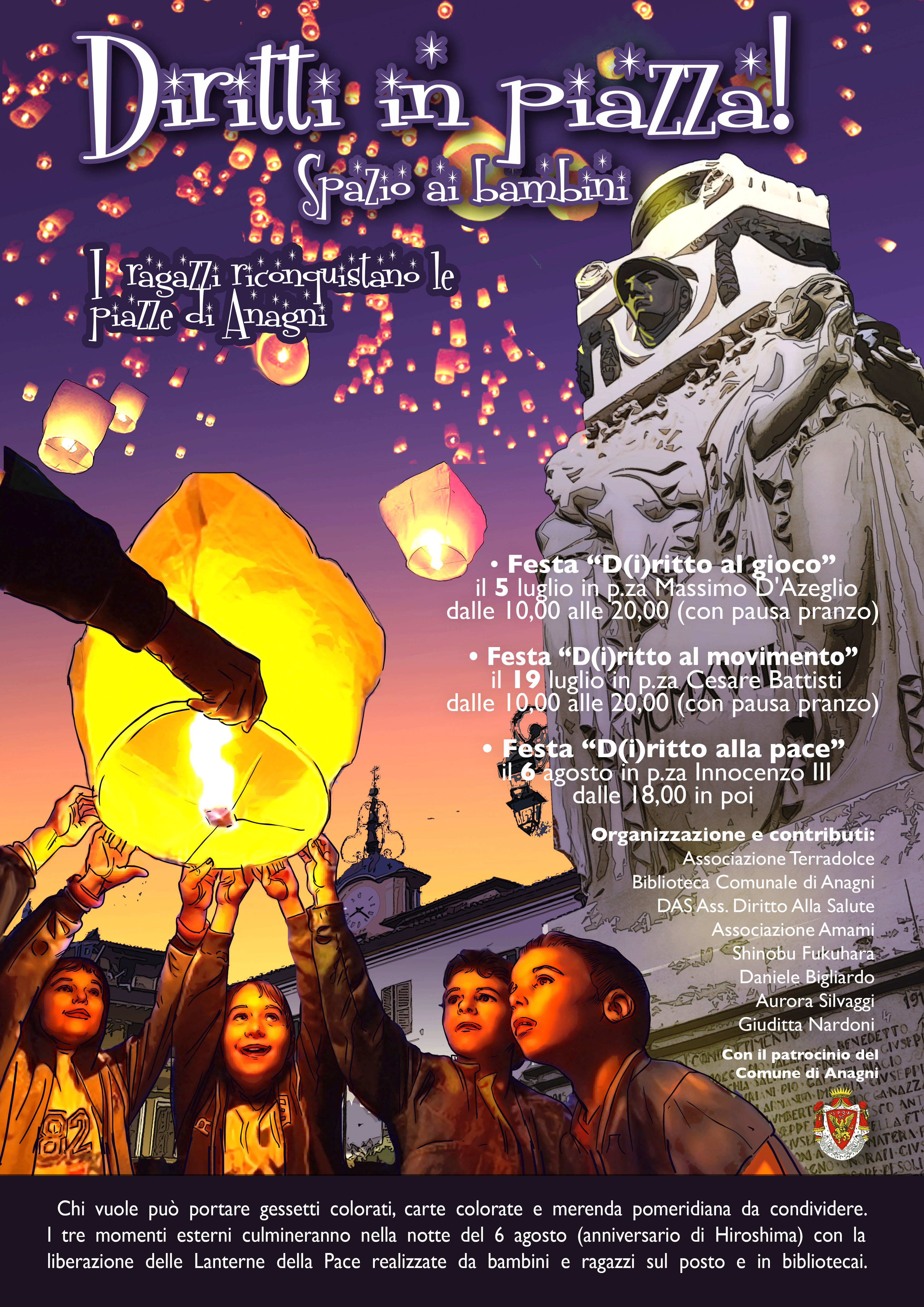 Dopo il primo appuntamento dello scorso 5 luglio‚ torna‚ sabato 19 luglio la manifestazione Diritti in piazza. Spazio ai bambini nelle piazze di Anagni. L’appuntamento è in piazza Cesare Battisti dalle ore 10.00 alle ore 20.00.