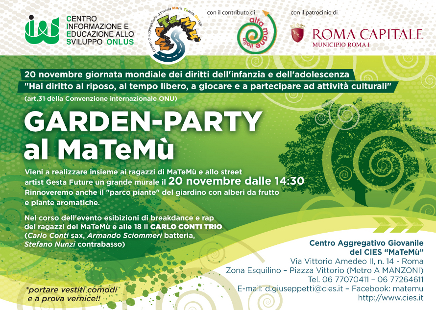 MaTeMù Centro di aggregazione giovanile ed il CIES Centro Informazione e Formazione allo sviluppo vi invitano a partecipare al Garden Party. Appuntamento giovedì 20 Novembre 2014 dalle ore 14.30 alle ore 19.30 in Via Vittorio Amedeo II‚ 14 a Roma insieme ai ragazzi del centro ed allo street artist Teddy Killer per realizzare un grande murales e per sistemare il giardino di Matemù con alberi da frutto e piante aromatiche.