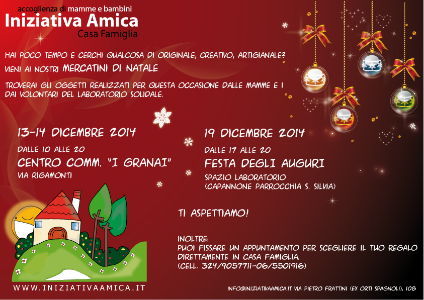 La Casa Famiglia Iniziativa Amica‎ invita a curiosare tra i suoi Mercatini di Natale per scegliere i regali di quest’anno. Gli oggetti sono realizzati dalle mamme e dai volontari del laboratorio solidale.