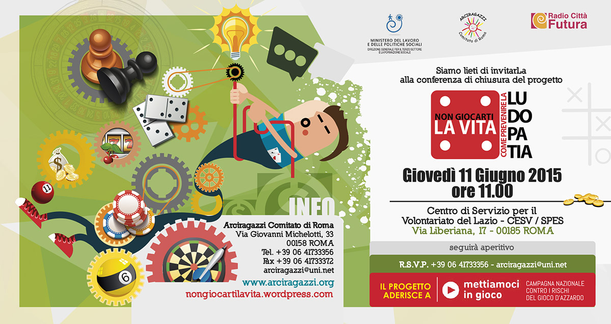 Giovedì 11 giugno alle ore 11.00 si terrà a Roma presso la sede di CESV e SPES Centri di Servizio per il Volontariato del Lazio in via Liberiana‚ 17 la conferenza di chiusura di Non giocarti la vita. Come prevenire la ludopatia.
