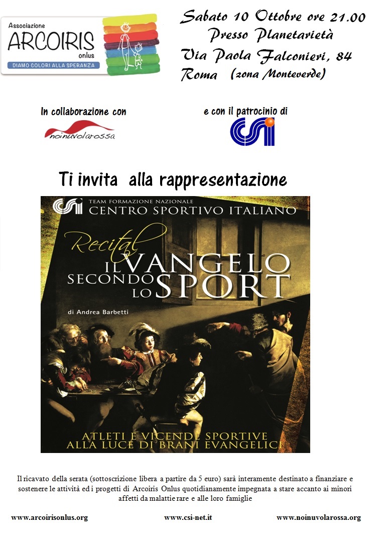 Sabato 10 ottobre 2015 alle ore 21.00 l’associazione Arcoiris invita a partecipare al Recital Il vangelo secondo lo sport di Andrea Barbetti‚ una serata organizzata insieme all’Associazione Culturale NoiNuvolaRossa e con il patrocinio del CSI (Centro Sportivo Italiano).
