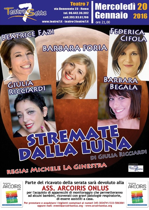 Il 20 gennaio 2016 alle ore 21.00 presso il Teatro 7 di Roma in via Benevento‚ 23 a Roma va in scena Stremate dalla Luna di Giulia Ricciardi per la regia di Michele La Ginestra. Parte del ricavato della serata sarà devoluto a sostegno delle attività‚ i progetti e le iniziative dell’Associazione Arcoiris Onlus che opera accanto ai bambini ricoverati al Bambin Gesù affetti da malattie rare gravi e delle loro famiglie. Per la prevendita dei biglietti e/o per qualsiasi informazione a contattare telefonicamente i numeri 333.5063061 (Gloriana) o 345.3034741 (Micaela) o via mail eventi@arcoirisonlus.org E’ importante sapere che per contribuire e sostenere Arcoiris è necessario acquistare i biglietti attraverso i canali dell’associazione e non direttamente a teatro.