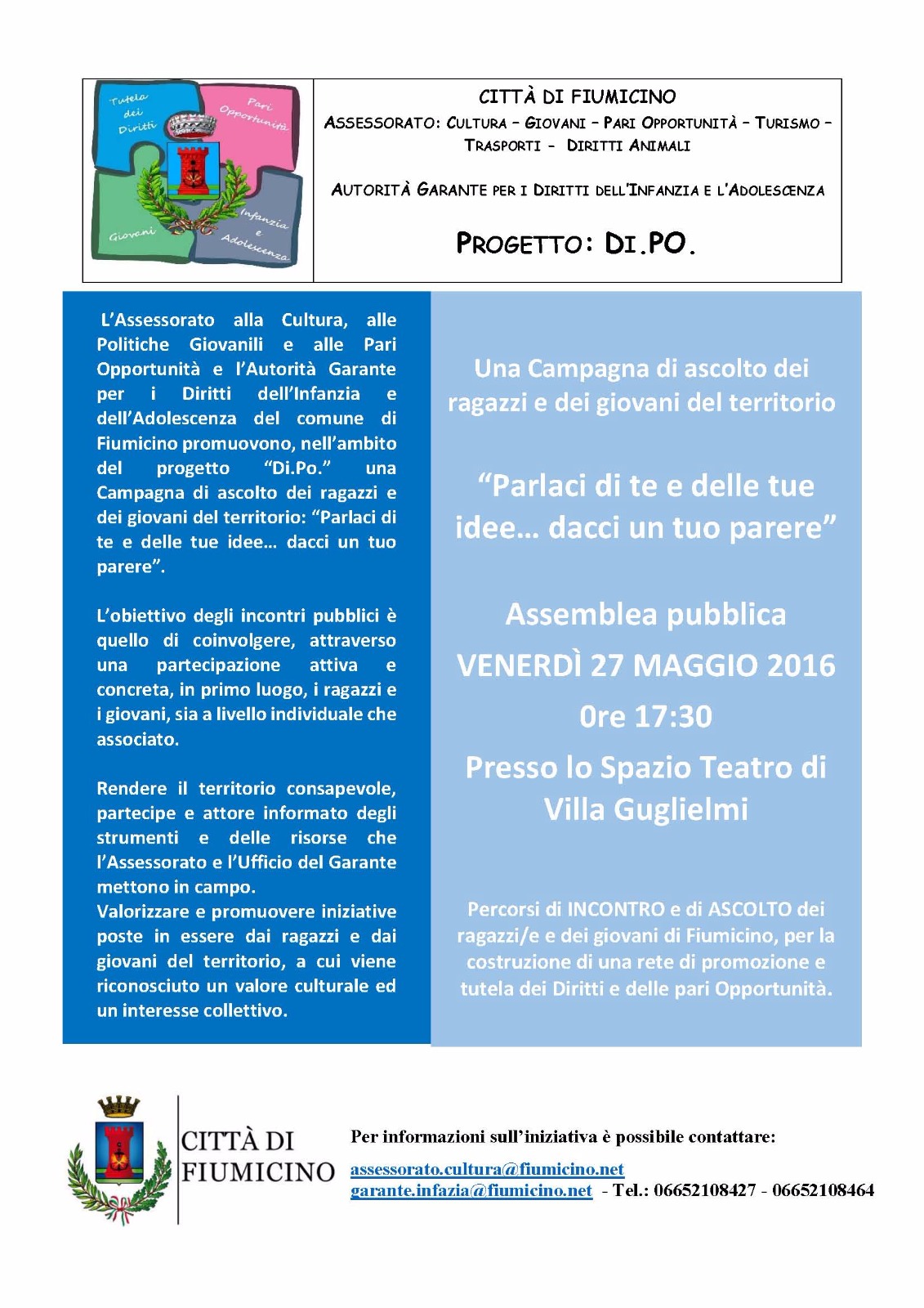 L’Assessorato alla Cultura‚ alle Politiche Giovanili ed alle Pari Opportunità e l’Autorità Garante per i Diritti dell’Infanzia e dell’Adolescenza del Comune di Fiumicino promuovono‚ nell’ambito del progetto “Di.Po.” una campagna di ascolto dei ragazzi e dei giovani del territorio “Parlaci di te e delle tue idee..dacci il tuo parere”.