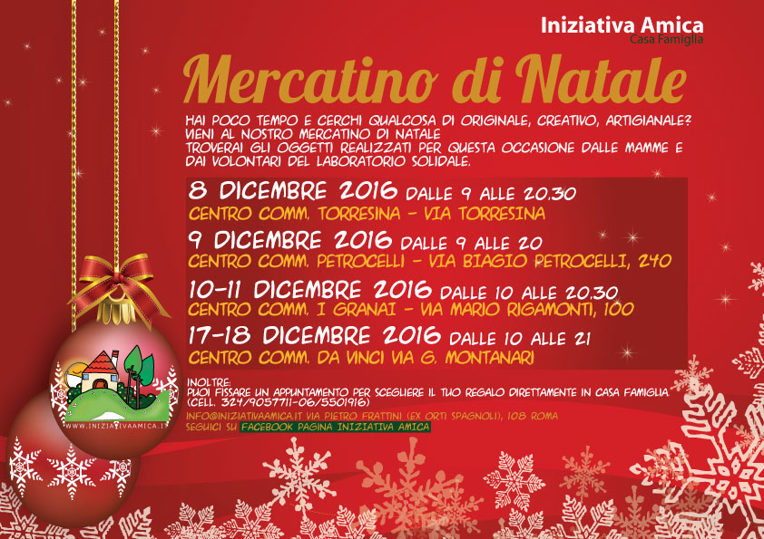 L’associazione Iniziativa Amica organizza a Roma‚ nel mese di Dicembre‚ Mercatini di Natale‚ dove sarà possibile acquistare oggetti realizzati dalle mamme e dai volontari del laboratorio solidale . Gli appuntamenti sono: Giovedì 8 dalle ore 9:00 alle ore 20:30‚ presso il Centro Commerciale Torresina in via Torresina Venerdì 9 dalle ore 9:00 alle ore 20:00‚ presso il Centro Commerciale Petrocelli in via Biagio Petrocelli‚ 240 Sabato 10 e domenica 11 dalle ore 10:00 alle ore 20:30‚ presso il Centro Commerciale i Granai in via Mario Rigamonti‚ 100 Sabato 17 e domenica 18 dalle ore 10:00 alle ore 21:00‚ presso il Centro Commerciale Da Vinci in via G. Montanari Inoltre sarà possibile fissare un appuntamento per acquistare gli oggetti direttamente nella Casa Famiglia di Iniziativa Amica in via Pietro Frattini 108‚ Roma. Per maggiori informazioni contattare i numeri: 06.5501916 e 324.9057711 o scrivere a: info@iniziativaamica.it