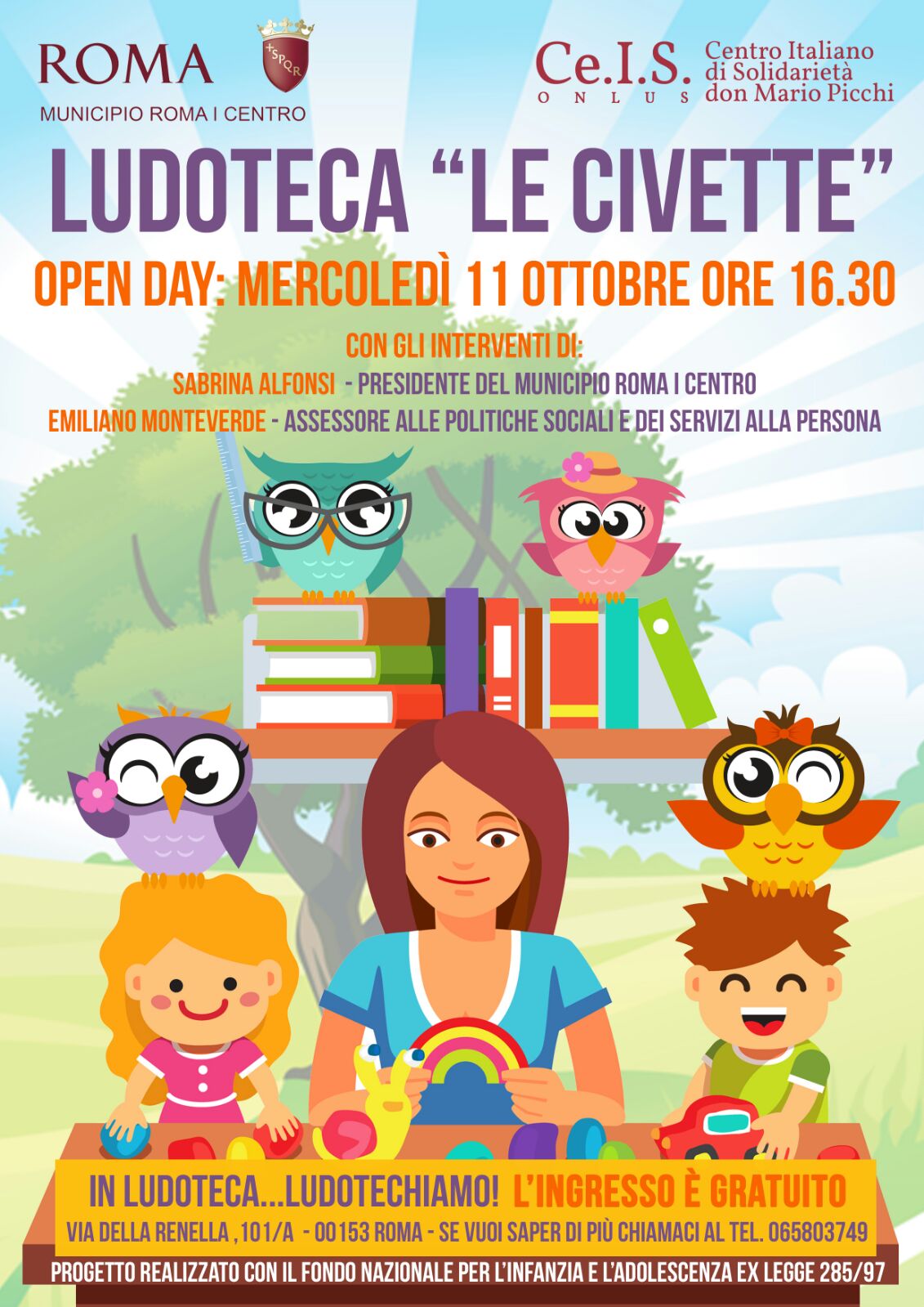 Mercoledì 11 ottobre dalle 16.30 il Primo Municipio di Roma in collaborazione con il C.e.i.s. Centro italiano di solidarietà Don Mario Picchi inaugura la nuova ludoteca "Le civette". La ludoteca aprirà a Trastevere in via della Renella‚ 101/A. Uno spazio gratuito dedicato ai bambini e alle bambine aperto tutti i pomeriggi dal lunedì al sabato‚ fino alle 19.00 Nel corso dell'inaugurazione interverranno Sabrina Alfonsi‚ Presidente del Primo Municipio e Emiliano Monteverde‚ Assessore alle Politiche Sociali e dei Servizi alla Persona.