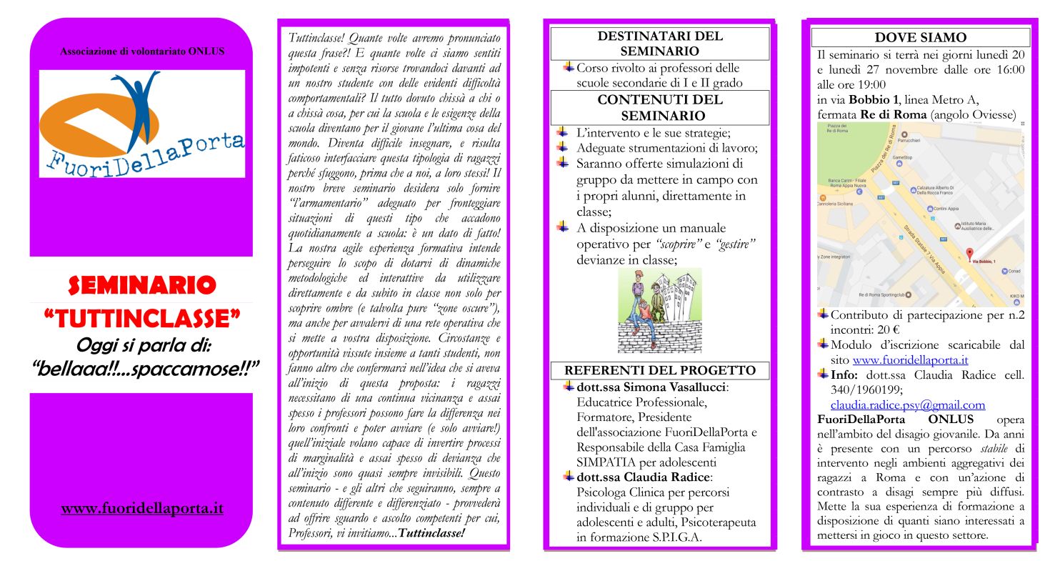 L’associazione FuoriDellaPorta organizza il seminario TUTTINCLASSE!‚ rivolto ai professori delle scuole secondarie di I e II grado. L’associazione presenta il corso così: TUTTINCLASSE! Quante volte avremo pronunciato questa frase?! E quante volte ci siamo sentiti impotenti e senza risorse trovandoci davanti ad un nostro studente con delle evidenti difficoltà comportamentali? Il tutto dovuto chissà a chi o a chissà cosa‚ per cui la scuola e le esigenze della scuola diventano per il giovane l’ultima cosa del mondo. Diventa difficile insegnare‚ e risulta faticoso interfacciare questa tipologia di ragazzi perché sfuggono‚ prima che a noi‚ a loro stessi! Il nostro breve seminario desidera solo fornire “l’armamentario” adeguato per fronteggiare situazioni di questi tipo che accadono quotidianamente a scuola: è un dato di fatto! Il seminario si terrà lunedì 20 e 27 novembre dalle ore 16.00 alle 19.00 in via Bobbio 1 a Roma. L’iscrizione al corso è obbligatoria ed è possibile farla scaricando il modulo dal sito dell’associazione