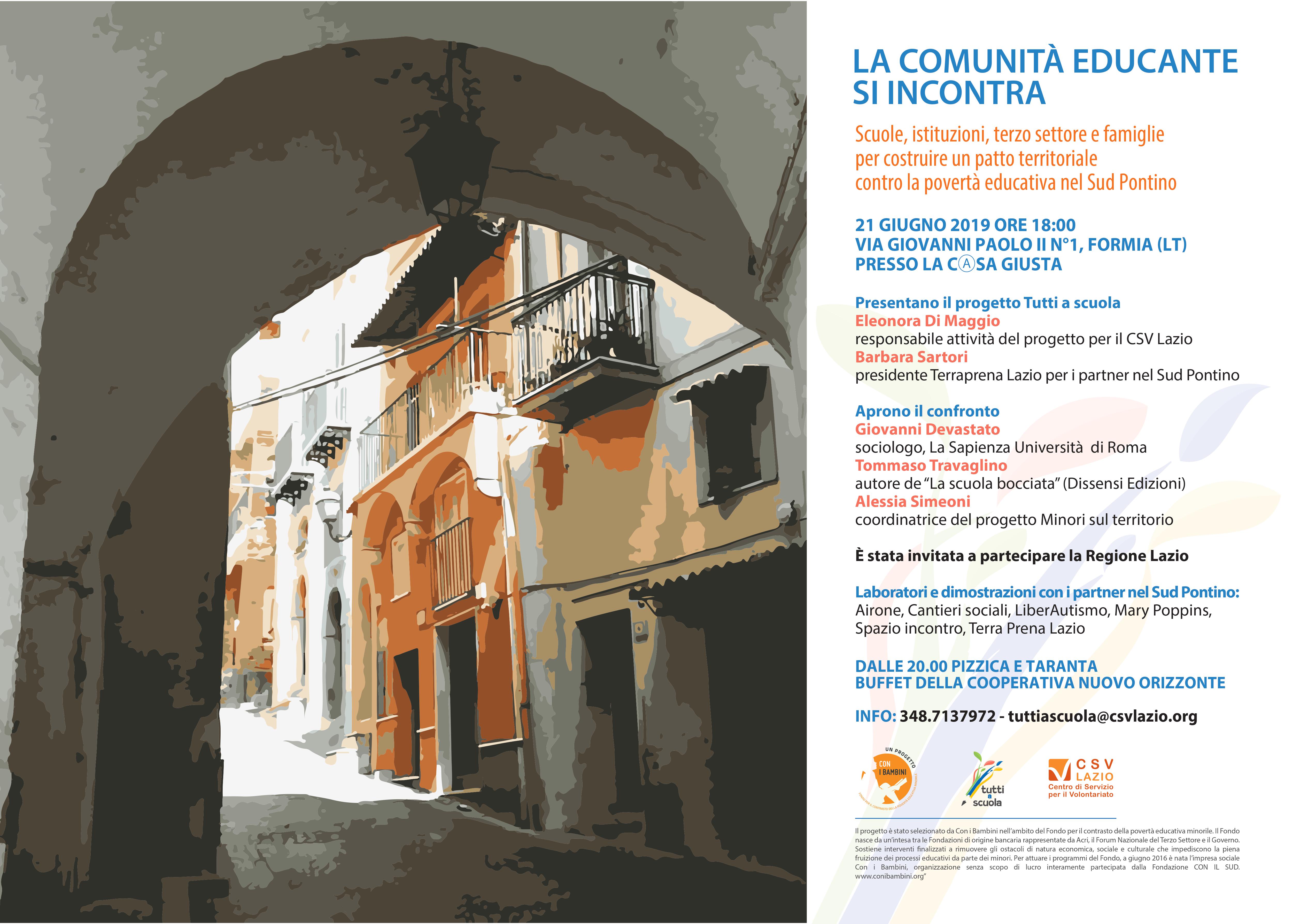Il progetto Tutti a scuola organizza il 21 Giugno a Formia l’iniziativa “La comunità educante si incontra”. Una giornata dedicata alla povertà educativa e al ruolo fondamentale della comunità educante. L’iniziativa è un tassello importante nella costruzione di un patto territoriale tra scuola‚ istituzioni‚ terzo settore e famiglie nel contrasto al fenomeno della povertà educativa nel territorio del Sud Pontino. Dopo la presentazione del progetto Tutti a scuola‚ si aprirà un confronto sul tema con i rappresentanti di scuole‚ istituzioni e organizzazioni del terzo settore‚ con le famiglie e i cittadini. I partner del progetto del Sud Pontino - Airone‚ Cantieri sociali‚ LiberAutismo‚ Mary Poppins‚ Spazio incontro‚ Terra Prena Lazio – porteranno dimostrazioni delle attività previste all’interno di Tutti a scuola. L’appuntamento è presso La Casa Giusta‚ in Via Giovanni Paolo II‚ 1 a Formia. Tutti a Scuola è un progetto che ha l’obiettivo di incidere sul circolo vizioso della riproduzione della povertà educativa‚ attraverso un’alleanza tra tutti i soggetti della comunità educante. Per questo coinvolge soggetti diversi: scuole‚ istituzioni locali‚ terzo settore‚ genitori‚ e gli adolescenti stessi. Sviluppa una rete di 62 enti che hanno come capofila il CSV e si sviluppa su quattro territori: Roma città‚ Castelli romani e litorale‚ Latina e provincia e Sud Pontino. Territori che hanno in comune alcuni elementi: povertà educativa‚ disagio sociale‚ forte presenza di migranti. Per informazioni: 348.7137972 - tuttiascuola@csvlazio.org Tutti a scuola è stato selezionato da Con i Bambini nell’ambito del Fondo per il contrasto della povertà educativa minorile. Il Fondo nasce da un’intesa tra le Fondazioni di origine bancaria rappresentate da Acri‚ il Forum Nazionale del Terzo Settore e il Governo. Sostiene interventi finalizzati a rimuovere gli ostacoli di natura economica‚ sociale e culturale che impediscono la piena fruizione dei processi educativi da parte dei minori. Per attuare i programmi del Fondo‚ a giugno 2016 è nata l’impresa sociale Con i Bambini‚ organizzazione senza scopo di lucro interamente partecipata dalla Fondazione CON IL SUD: www.conibambini.org